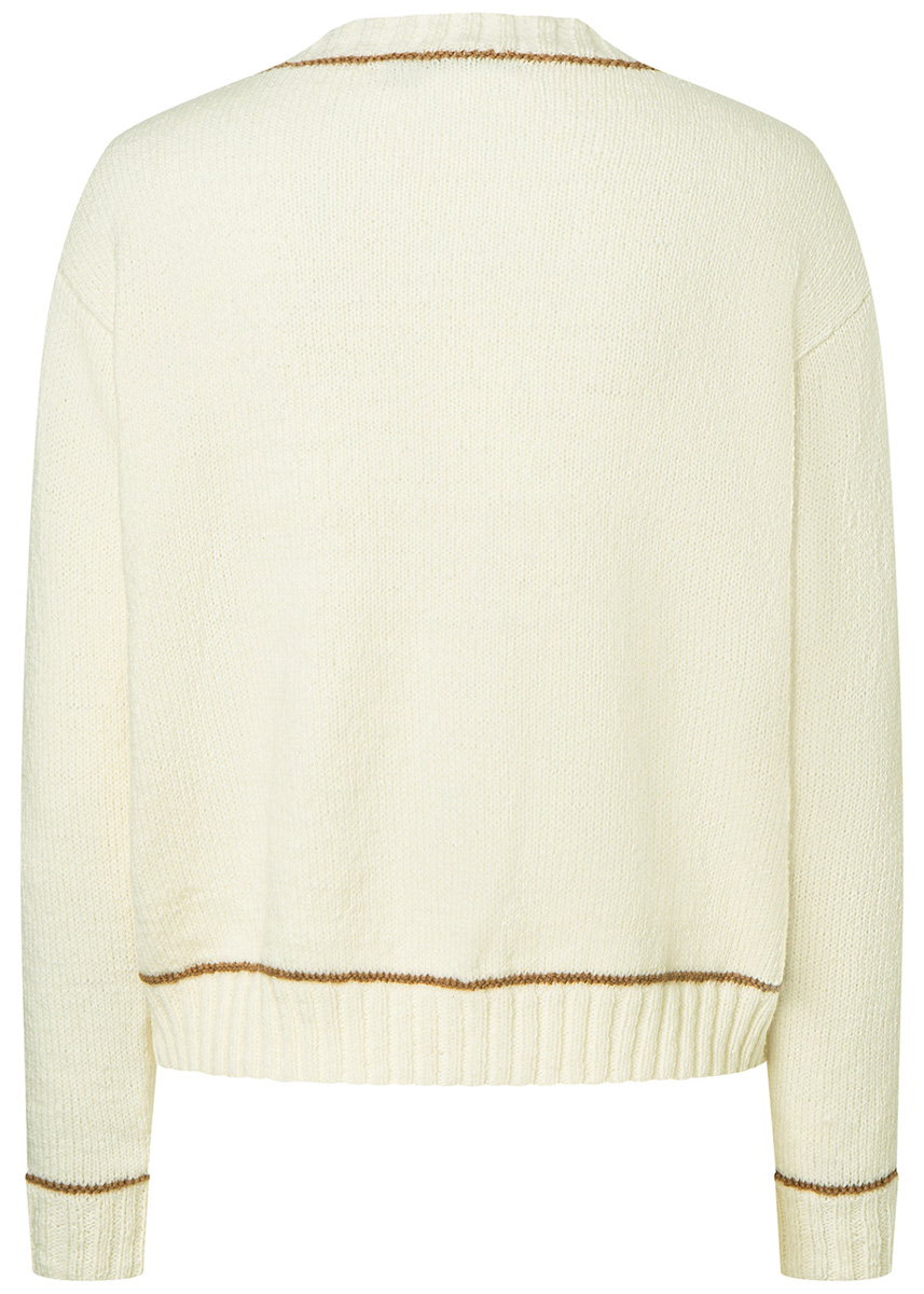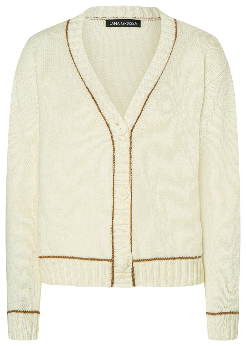 300 (350–400) г белой суровой (цв. 9) и 50 г цвета верблюжьей шерсти (цв. 45) пряжи Cashmere 16 Fine (80% шерсти мерино, 10% кашемира, 10% полиа- мида, 320 м/50 г) фирмы Lana Grossa; прямые спицы № 3 и № 4, круговые спицы № 3 длиной 100 см; 3 пуговицы диаметром 20 мм