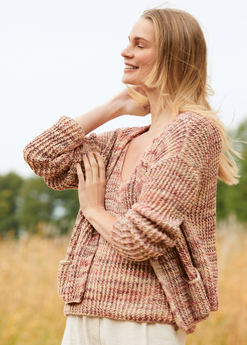 Lana Grossa-Qualität „Certo Print” (100 % хлопок, длина нити = ок. 115 m/50 g): ок. 500 (550) г бежевый/лососевый/ежевика/баклажановый (цв. 108); сп. № 7 и 8; 1 пуговица с 2-дырками, ø 28 мм