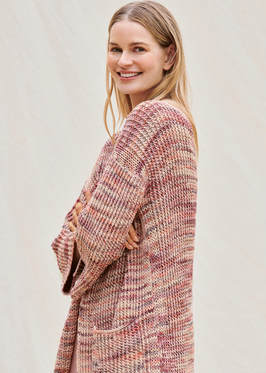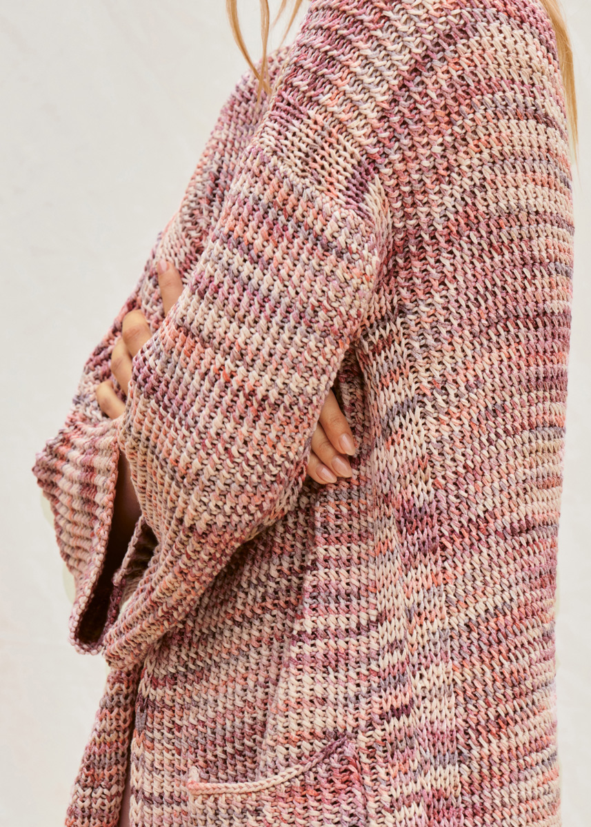 Lana Grossa-Qualität „Certo Print” (100 % хлопок, длина нити = ок. 115 m/50 g): ок. 850 (900) г бежевый/ лососевый/ежевика/баклажановый (цв. 108); сп. № 5 и 6, 1 крючок № 5