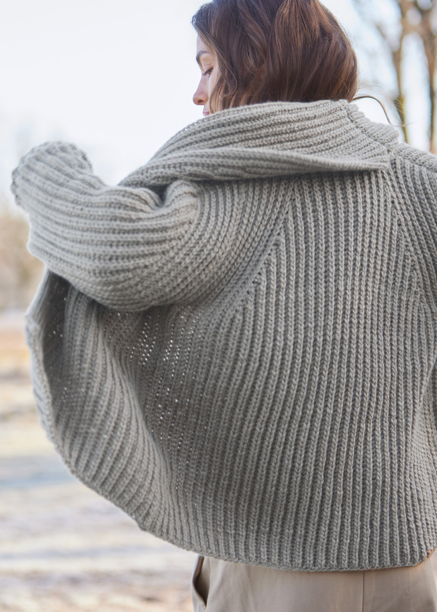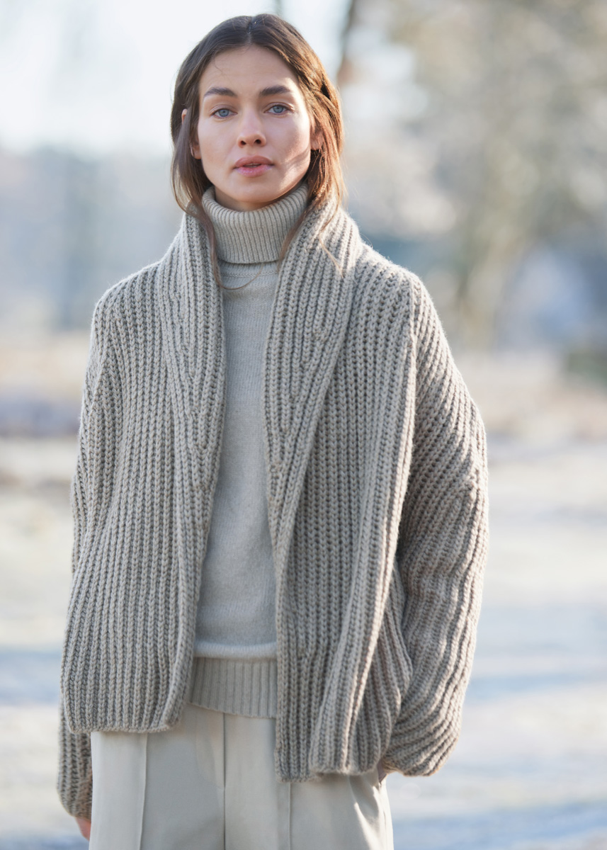 Lana Grossa-Qualität „Cool Merino Big“ (90 % шерсть (меринос), 10 % полиамид, длина нити = ca 90 m/50 g): ок 800 (850–900–950) г светло серый (цв 218); сп. № 5.