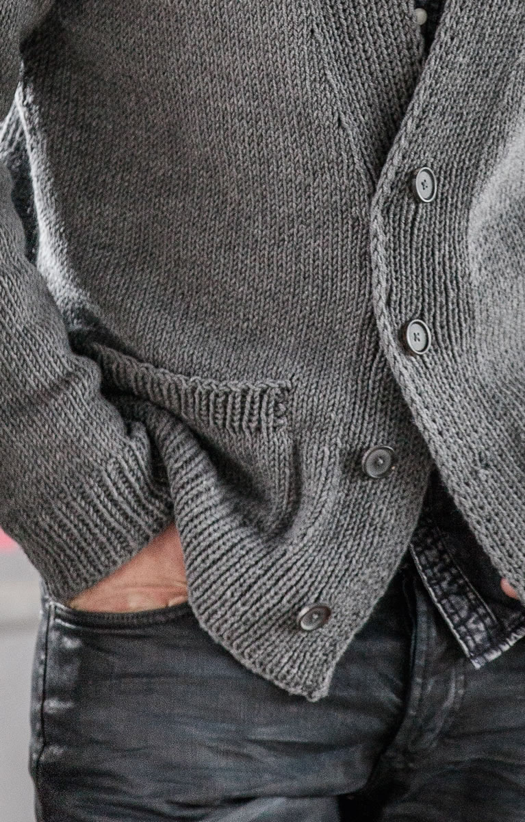 650 (700) г темно-серой меланжевой (цвет 617) пряжи Cool Wool Big фирмы Lana Grossa (100 % шерсти мерино экстрафайн, 120 м/50 г); прямые спицы № 4 и 4,5, 4 пуговицы (цвет серый меланжевый, Ø 23 мм) фирмы UNION KNOPF.