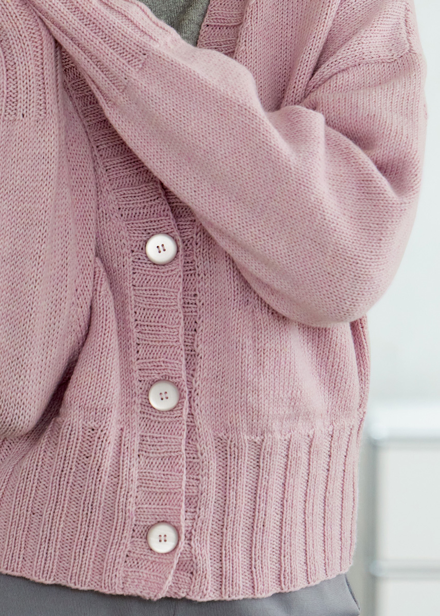 „Cool Wool Mélange “[100% шерсть меринос, длина нити 160 m/50 g]; ок. 500 (550–600– 650) г сиренево-розовый меланжевый (цв 117); кр. сп. № 3,5–4; 3 большие пуговицы 22 мм ø