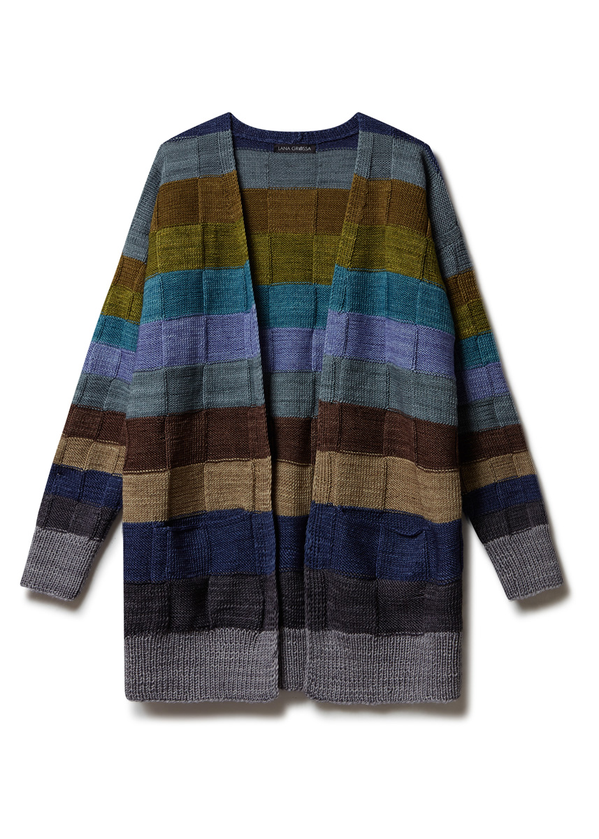 150 (150–200) г зелено-серой (цв. 7368), 150 (150–200) г темно-синей (цв. 7366), 150 (150–200) г светло-серой (цв. 7369), 100 г цвета ан- трацита (цв. 7370), 100 г песочно-бежевой (цв. 7382), 100 г темно-коричневой (цв. 7384), 100 г светло-синей (цв. 7378), 100 г оливковой (цв. 7361), 100 г темно- оливковой (цв. 7381) и 50 (100–100) г петрольной (цв.7379) пряжи Cool Wool Vintage (100% шерсти мерино экстрафайн, 160 м/50 г) фирмы Lana Grossa; прямые спицы № 3 и № 3,5.