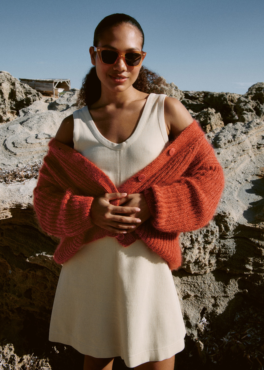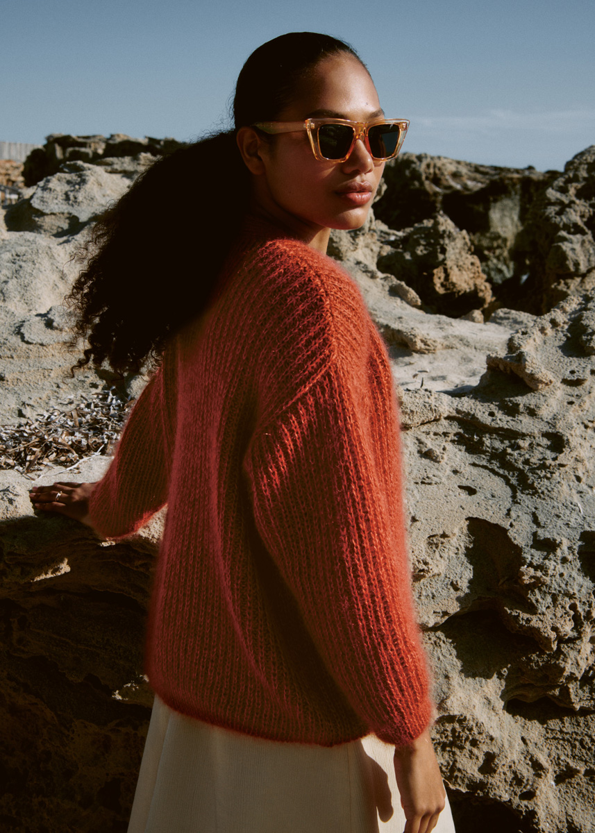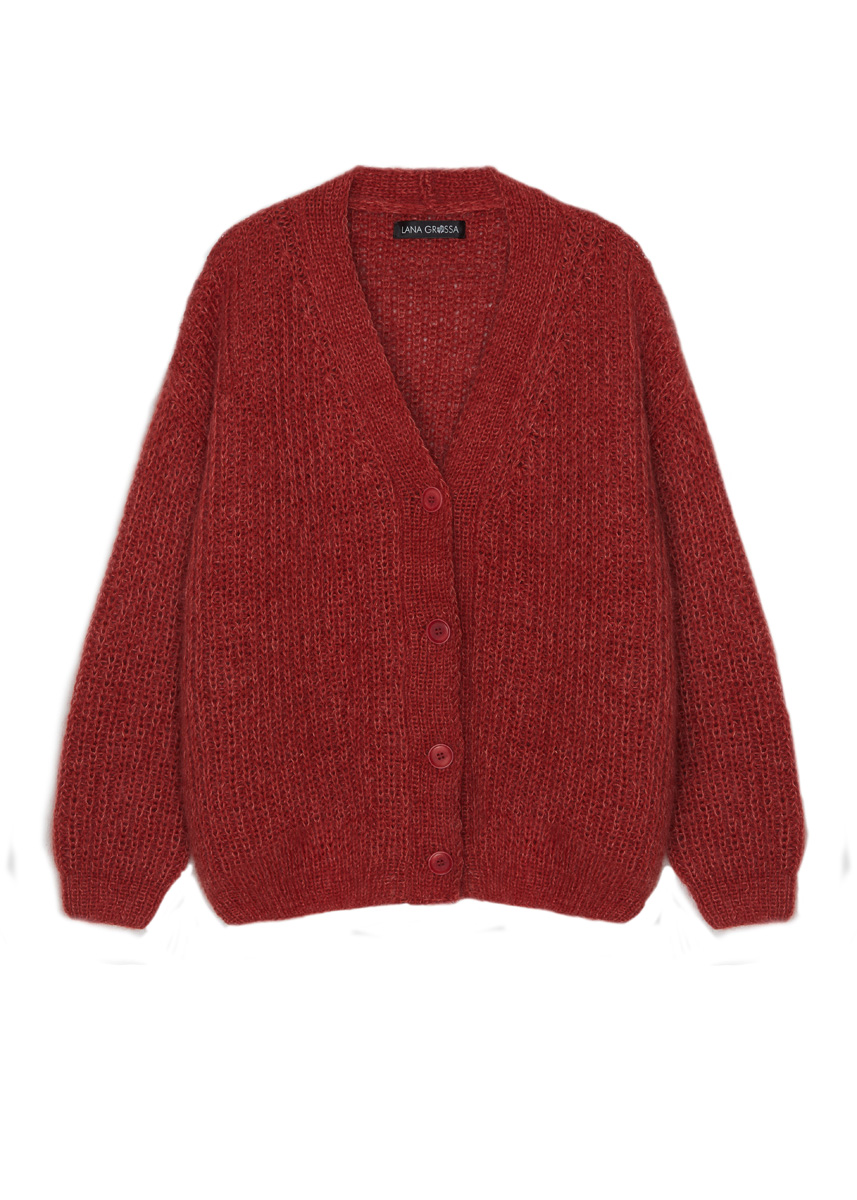 Lana Grossa-Qualität „Cotton Wool” (53 % шерсть (меринос), 47 % хлопок, длина нити = ок. 195 m/50 g): ок. 300 (350–400) г оранжевый (цв. 15) и Lana Grossa-Qualität „Silkhair” (70 % мохер (суперкид), 30 % шёлк, длина нити = ок. 210 m/25 g): ок. 150 (175–200) г кирпичное красный (цв. 164); сп. № 4 и 4,5; 4 пуговицы, ø 23 мм