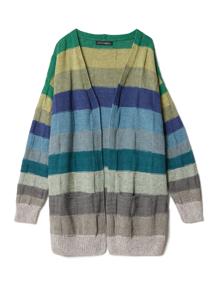 для варианта В: по 50 г бе- ло-бежевой (цв. 7), светло-серой (цв. 14), темно-серой (цв. 15), цвета мяты (цв. 9), цвета зеленого опала (цв. 18), сине-серой (цв. 8), серо-синей (цв. 16), чернильно-синей (цв. 17), серо-зеленой (цв. 10), желто-зеленой (цв. 11) и травянисто-зеленой (цв. 19), дополнительно еще 50 г темно-серой (цв. 15) пряжи Diversa (74% хлопка, 26% вискозы, 210 м/50 г) фирмы Lana Grossa; прямые спицы № 3 и № 3,5, круговые спицы № 3 длиной 40 см.