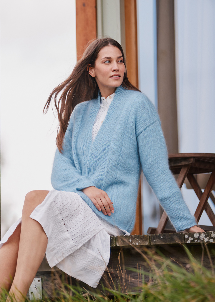 300 (350–400–450) г небесно-си- ней (цв. 69) пряжи Ecopuno (72% хлопка, 17% шерсти мерино, 11% альпака бэби, 215 м/50 г) фирмы Lana Grossa и 150 (175–200–225) г нежно-синей (цв. 201) пряжи Silkhair (70% мохера суперкид, 30% шелка, 210 м/25 г) фирмы Lana Grossa; прямые спицы № 4,5, длинные круговые спицы № 4,5, крючок № 4.
