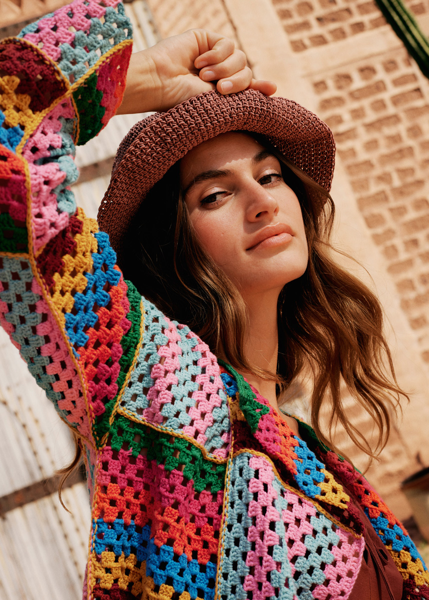 Lana Grossa-Qualität „Elastico” (96 % хлопок, 4 % полиэстер (элите), длина нити = ок. 160 m/50 g): по ок. 100 г светлый сине-голубой (цв. 148), ярко-розовый (цв. 178), бутылочный цвет (цв. 174), цикламеновый (цв. 144), тыквенный (цв. 150), горечавки синий (цв. 157), желтый нарцисс (цв. 139) и ориент красный (цв. 168); 1 крючок № 3,5