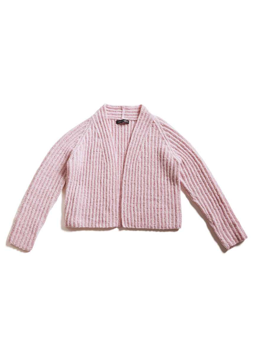550 (600–650) г розо- вой (цв. 3) пряжи Fantasia (50% хлопка, 24% вискозы, 16% альпака бэби, 10% шер- сти мерино экстрафайн, 125 м/50 г) фирмы Lana Grossa; прямые спицы № 4.