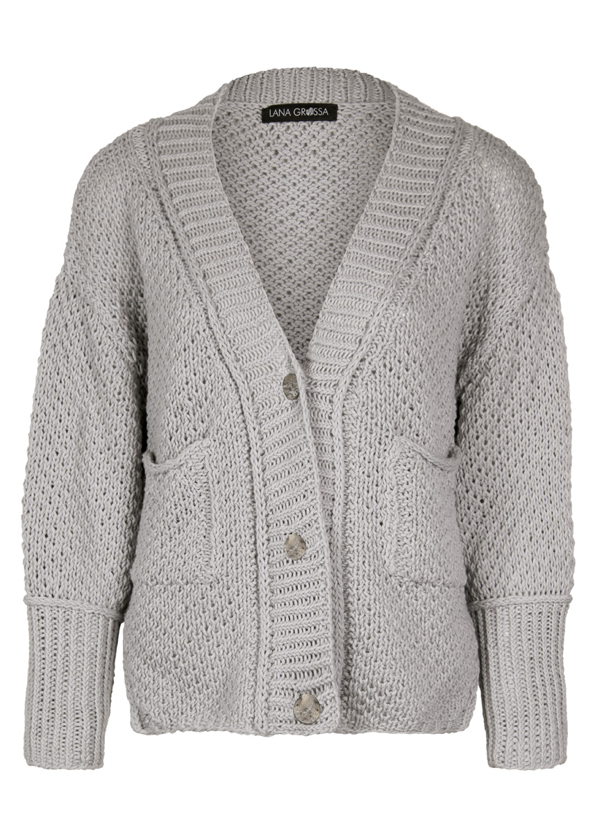 Lana Grossa-Qualität „Fourseason” (45 % биол. меринос, 40 % биол. хлопок, 15 % перераб. кашемир, длина нитки = 105 m/50 g): 400 (450) г светло серый (цв. 26); сп. № 5 и 6, 1 кр. сп. № 5, 120 см длиной; 3 кнопки от Union Knopf, арт. 453708, 2-дырки, цв. 76 серый, ø 25 мм