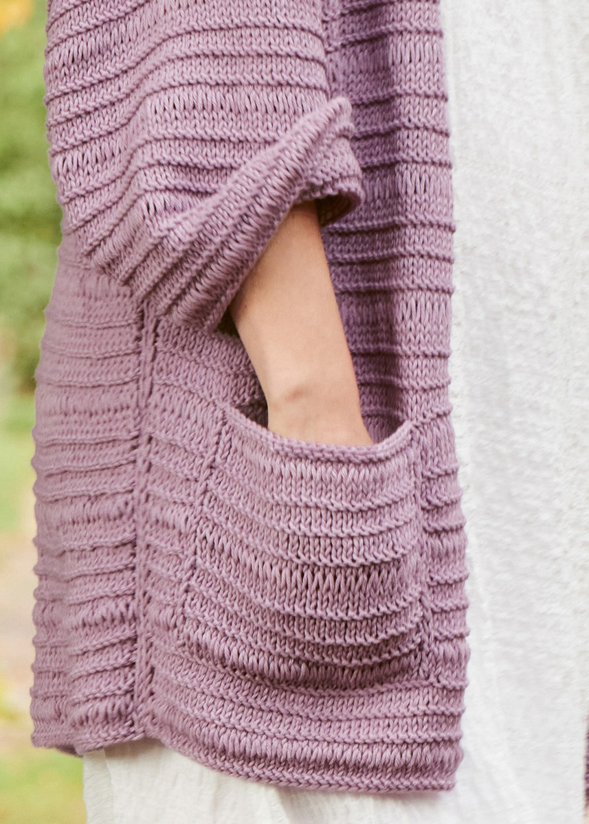 Lana Grossa-Qualität „Fourseason” (45 % орг. шерсть (меринос), 40 % биохлопок, 15 % перераб. кашемир, длина нити = ок. 105 m/50 g): ок. 650 (700 – 750) г серо-фиолетовый (цв. 17); сп. № 6 и 7
