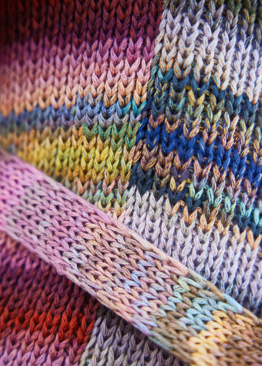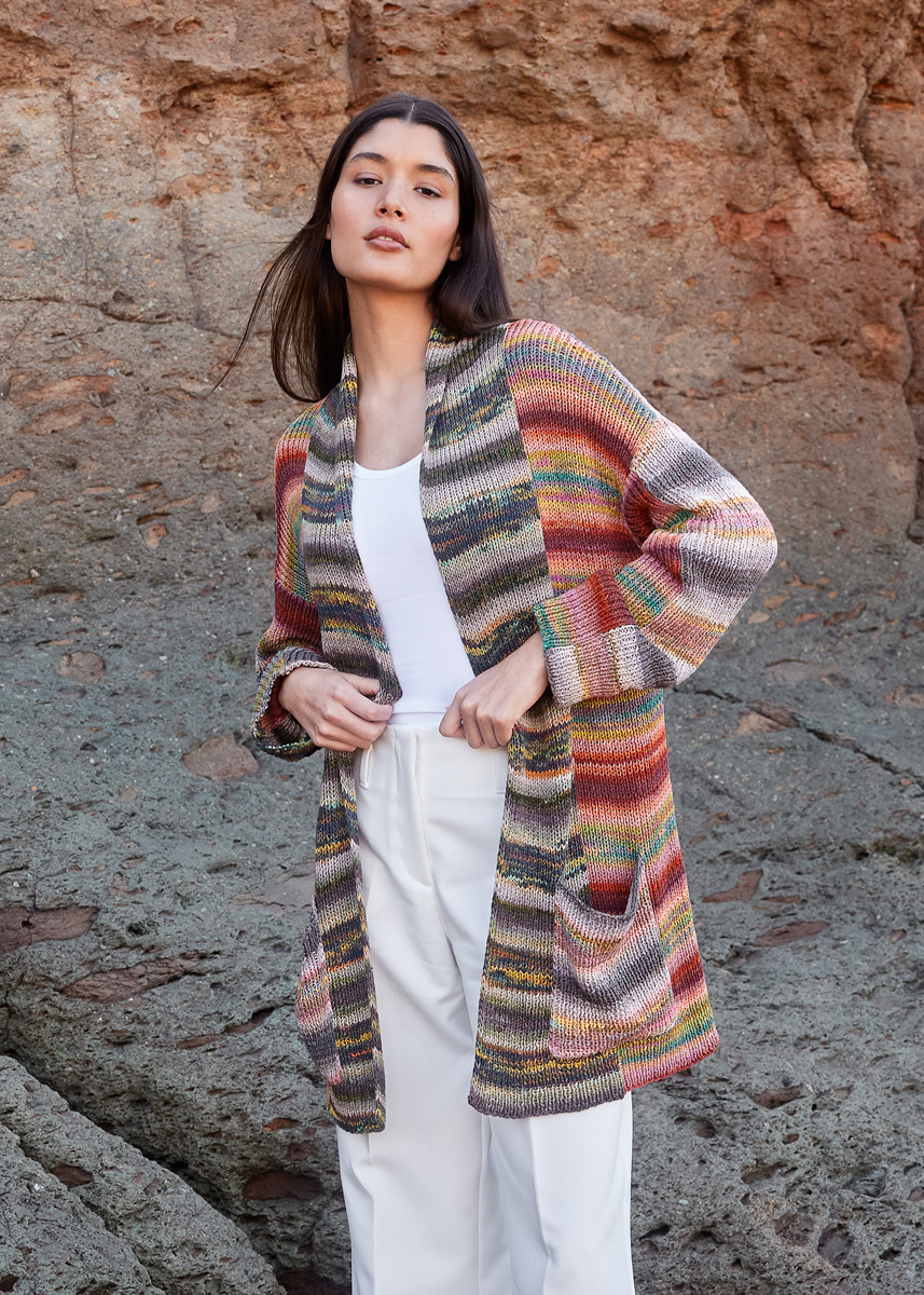 3 (4–4–4) мотка = 300 (400–400– 400) г серо-бежевой/оливковой/серо-коричневой/-зеле- ной/бирюзовой/желто-зеленой (цв. 173), 3 (3–4–4) мот- ка = 300 (300–400–400) г оранжевой/цвета увядшей ро- зовой розы/розовой/желто-зеленой/желтой/бирюзовой/ ярко-розовой/лиловой/изумрудной/ежевичной (цв. 172) и 2 (3–3–3) мотка = 200 (300–300–300) г светло-беже- вой/бежевой/розовой/бирюзовой/ желтой/цвета эрики/ серо-коричневой (цв. 171) пряжи Gomitolo Arco (52% хлопка, 48% акрила, 260 м/100 г) фирмы Lana Grossa; пря- мые спицы № 4 и крючок № 3,5.