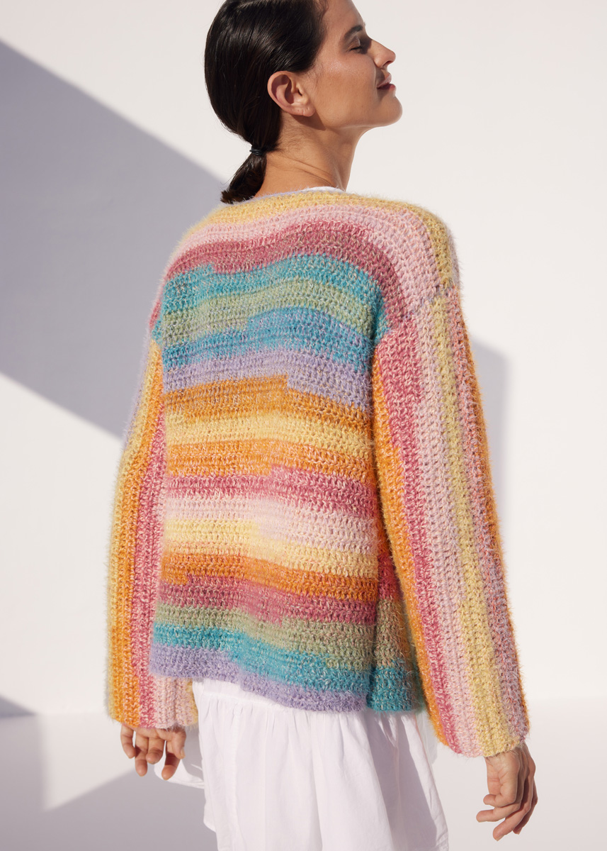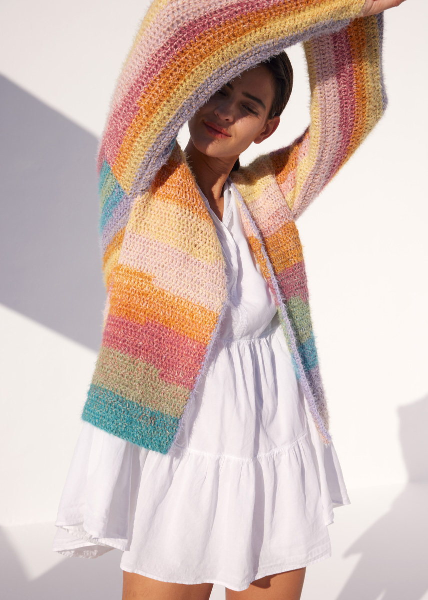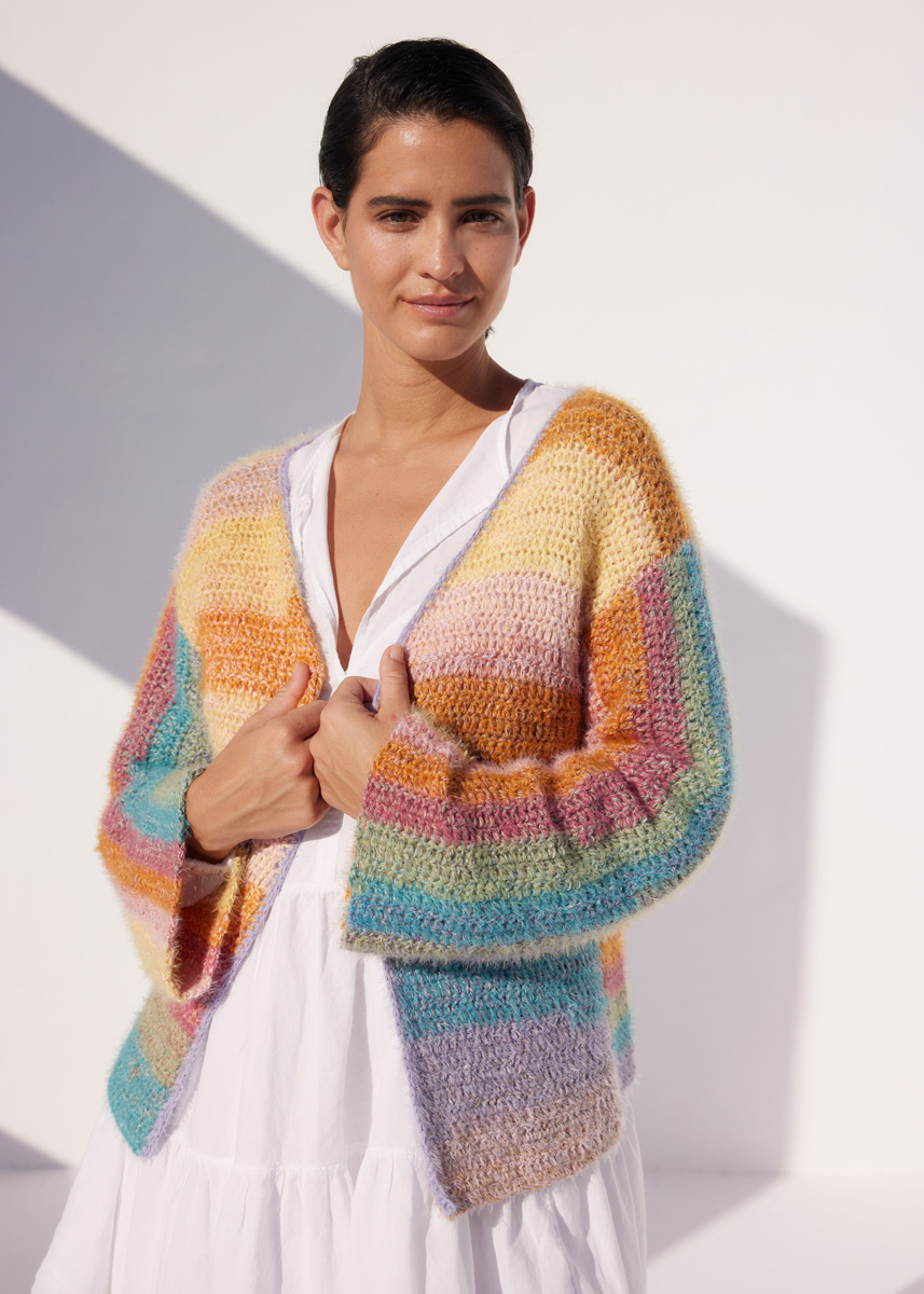 400 (500–500) г цвета ванили/розовой/античной фиолетовой/серо- зеленой/серо-коричневой/терракотовой (цв. 1014) пряжи Gomitolo Collina (72% хлопка, 28% вискозы, 260 м/100 г) и по 50 г оран- жевой (цв. 11), бирюзовой (цв. 26), желтой (цв. 32), лиловой (цв. 35), розовой (цв. 36), вереск (цв. 38) и нежно-зеле- ной (цв. 43) пряжи Per Fortuna (74% хлоп- ка органического (эко), 26% полиамида, 190 м/50 г) фирмы Lana Grossa; крючок № 5