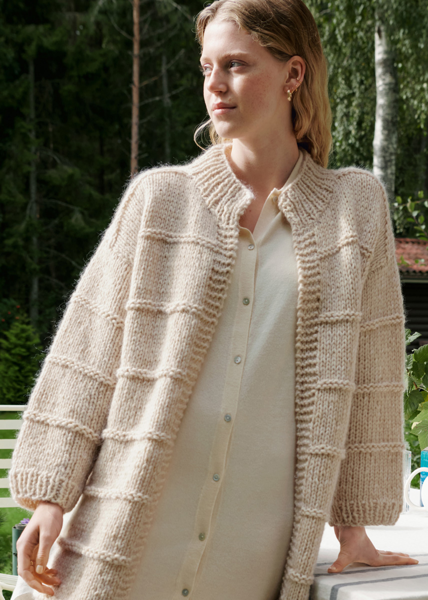 500 (550–600) г бело-бежевой (цв. 7) пряжи Lala Berlin Lovely Cotton (75% овечьей шер- сти (мериносовой шерсти суперфайн), 25% хлопка, 90 м/50 г), 100 (125– 150) г белой (цв. 117) пряжи Silkhair (70% мохера (суперкид), 30% шелка, 210 м/25 г) фирмы Lana Grossa; пря- мые спицы № 10, круговые спицы № 10.
