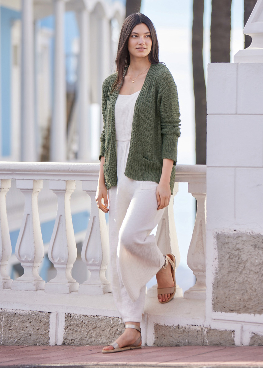 Lana Grossa-Qualität „Landlust Sommerseide“ (50% шёлк, 50% хлопок, длина нити 170 m/50 g), 500 (550–600) г темно зелёный/бежевый (цв 30); кр. сп. № 3,5 и 4, длиной 100 см