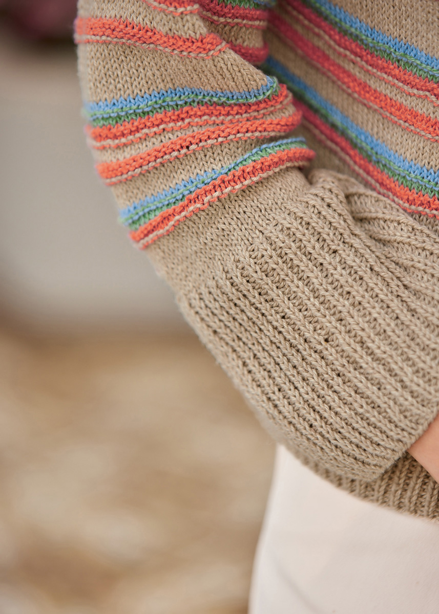 Lana Grossa-Qualität „Landlust Sommerseide“ (50% шёлк, 50% хлопок, длина нити 170 m/50 g), 300 (350 - 400 - 450) г бежевый (цв 32), 50 (100 - 100 - 100) г пинк (цв 33) и по 50 г зелёное яблоко (цв 36) и джинсы (цв 35); сп. № 3,5 и 1 кр. сп. № 4, длиной 80 см