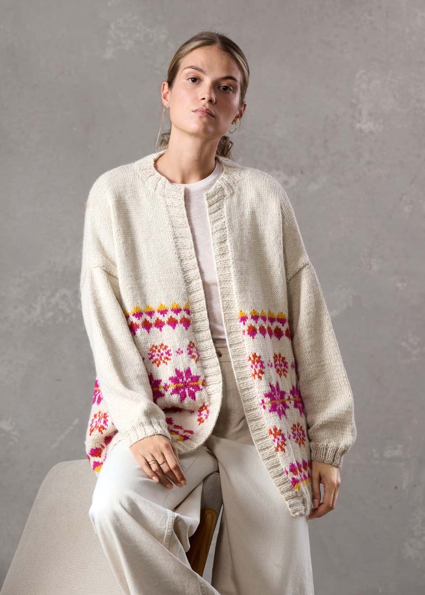 700 (800/850/950) г светло-бежевой (цв. 10), по 100 г ярко-розовой (цв. 3) и ржавооранжевой (цв. 4), 50 г желтой (цв. 1) пряжи Natural Lama Chunky (100% шерсти лама бэби, 70 м/50 г) фирмы Lana Grossa; круговые спицы № 4,5 и № 5 длиной 80–100 см.