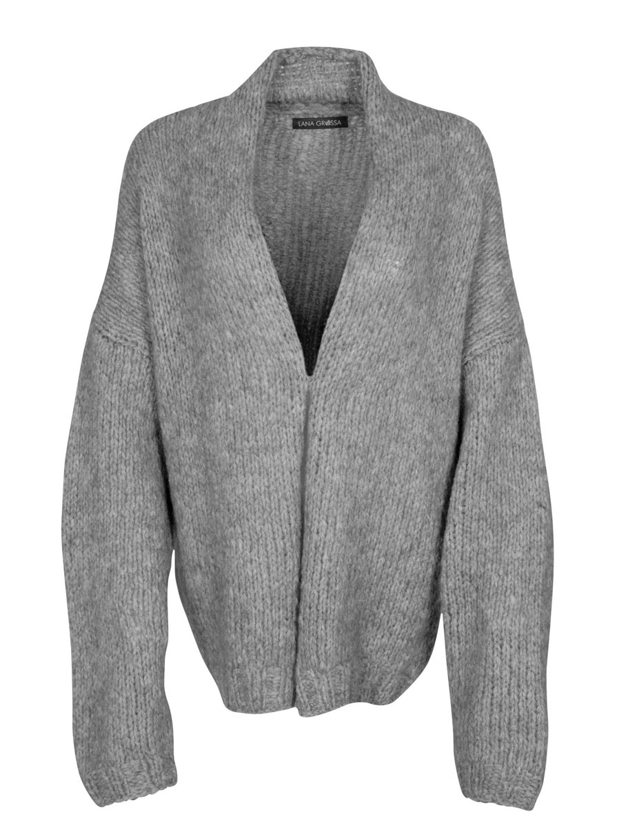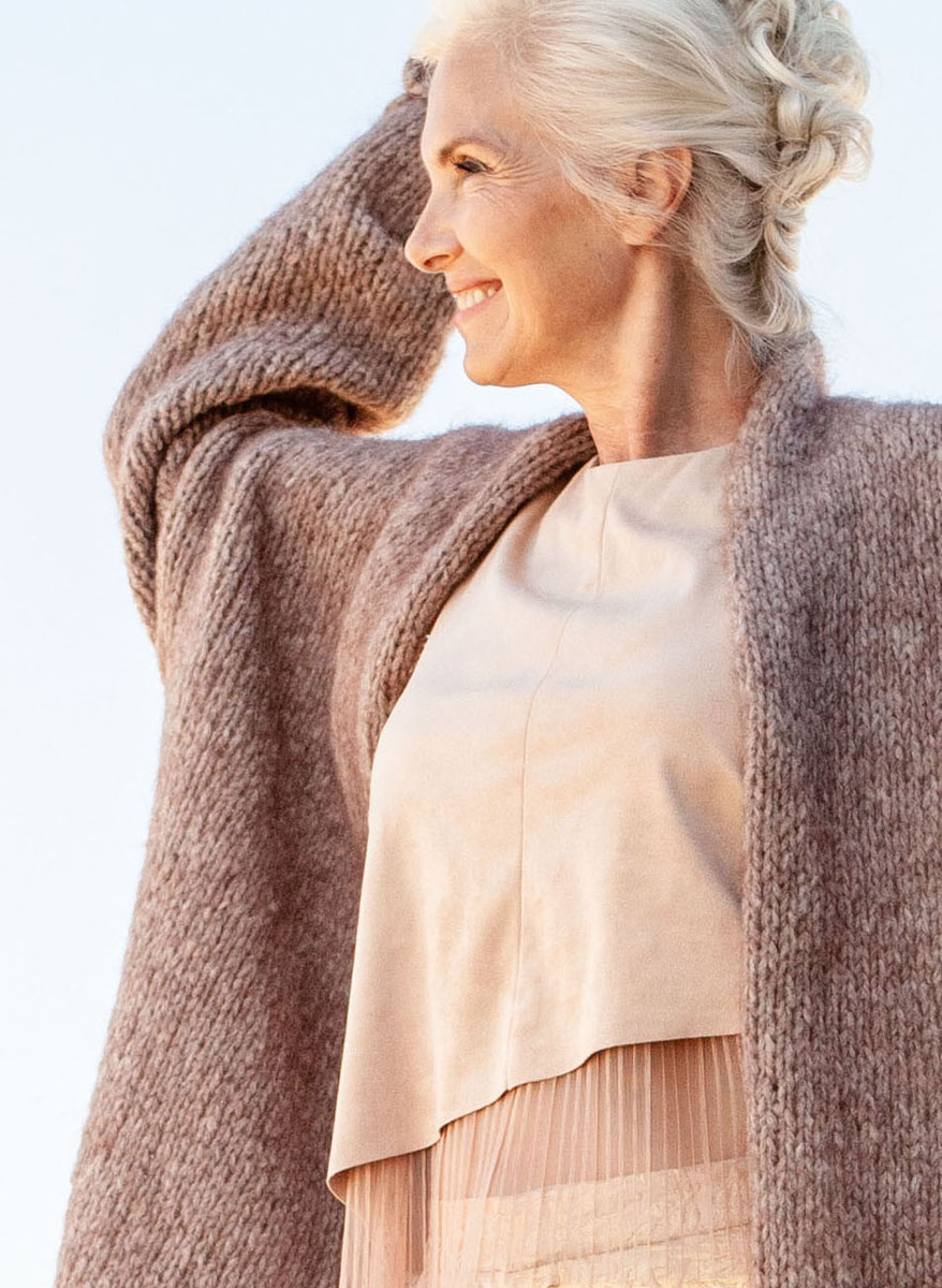 Lana Grossa Peloso (54 % меринос, 26 % мохер, 20 % полиакрил, длина нитки 210 м/50 г), 450 (500 – 550) г серо-бежевый (цв. 8); спицы № 5,5 и 7