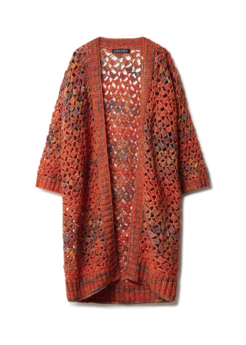350 г цвета ржавчины/цвета охры/ коричневой/цвета хаки/медно-красной (цв. 11) пряжи Picasso (36% шерсти мерино экстрафайн, 36% альпака бэби, 28% полиамида, 210 м/50 г) фирмы Lana Grossa; крючок № 7, круговые спицы № 6 длиной 100 см, чулочные спицы № 6.