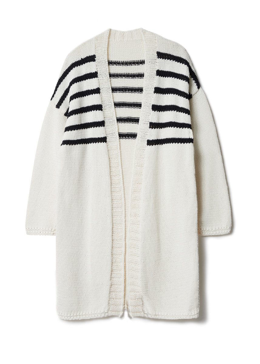 550 (600–650) г кремовой (цв. 14) и 50 (100–100) г черной (цв. 24) пряжи Promessa (70% органического хлопка, 30% полиамида восстанов- ленного, 125 м/50 г) фирмы Lana Grossa; прямые спицы № 5,5 и № 6, а также круговые спицы № 5,5 длиной 120 см