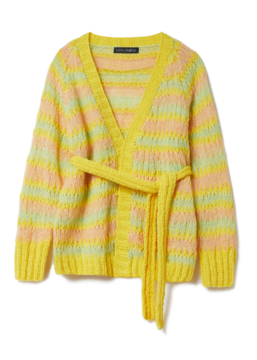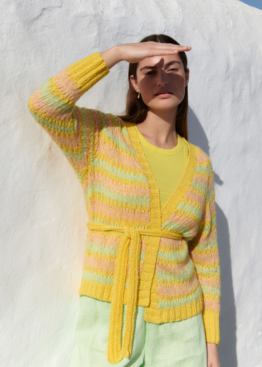 200 г желтой (цв. 14) пряжи Riccio (84% хлопка, 16% полиами- да, 110 м/50 г) и 50 г абрикосовой (цв. 6), 50 г нежно-зеленой (цв. 20) пряжи Bella (35% хлопка, 30% нейлона, 25% альпака бэби, 10% шерсти мерино, 250 м/25 г) фирмы Lana Grossa; прямые спицы № 5,5 и № 6, круговые спицы № 5,5 длиной 100 см.