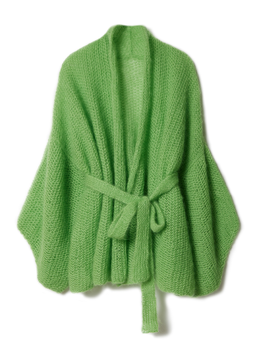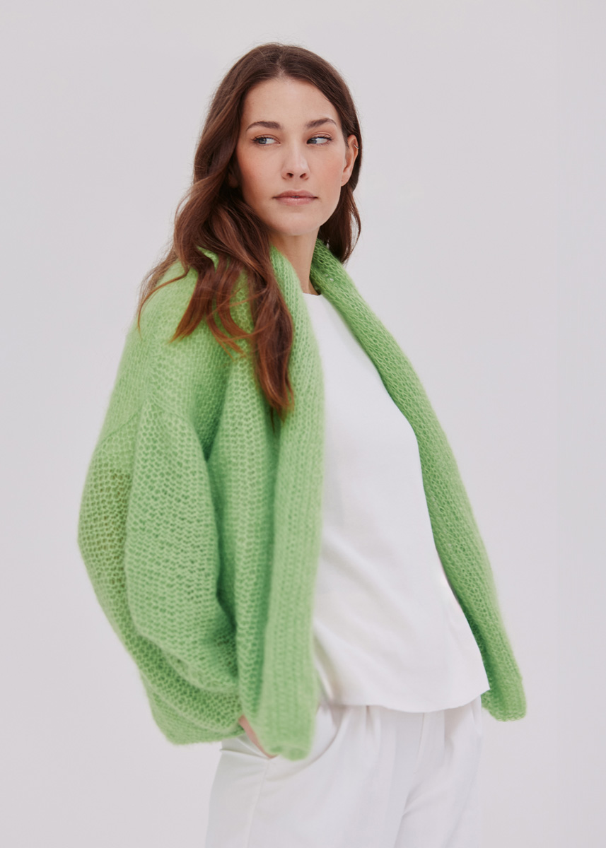 250 (275–300–325) г цвета ве- сенней зелени (цв. 191) пряжи Silkhair (70% мохера суперкид, 30% шелка, 210 м/25 г) фирмы Lana Grossa; прямые спицы № 6, короткие круговые спицы № 6, крю- чок № 6; 1 маркер для петель