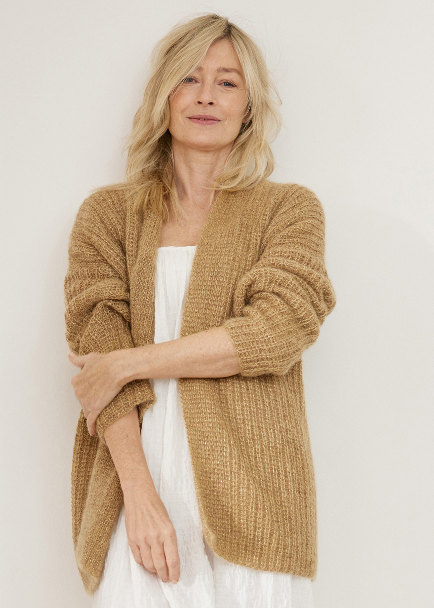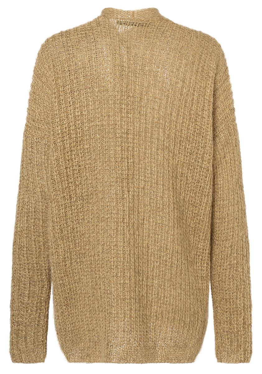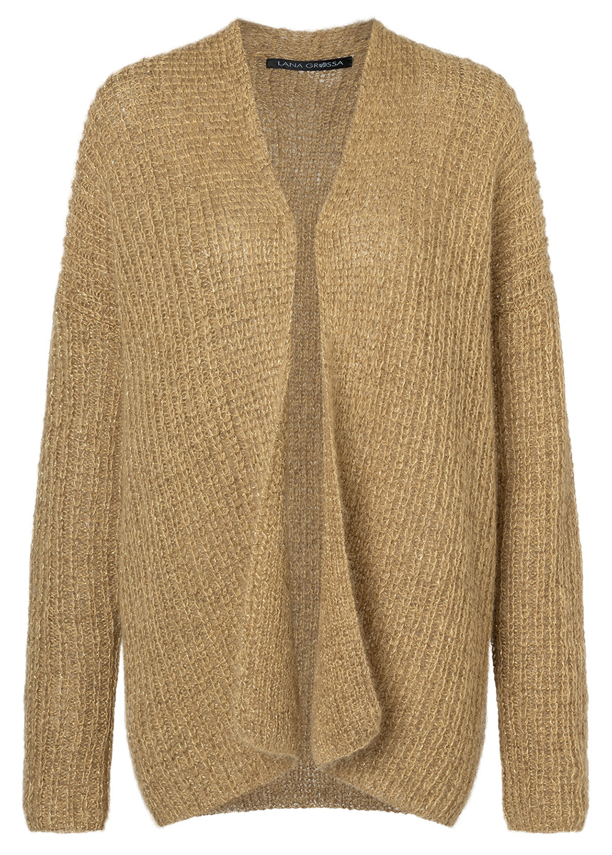 Lana Grossa Silkhair (70% мохер, 30% шёлк, длина нити 210 m/25 g), 200 (225 – 250) г желтый песок (цв 153) и Lana Grossa Brillino (83% вискоза, 17% металл. фибра, длина нити 200 m/25 g), 200 (225 – 250) г легко коричневый/ золотой (цв 4); сп. № 4 и 4,5