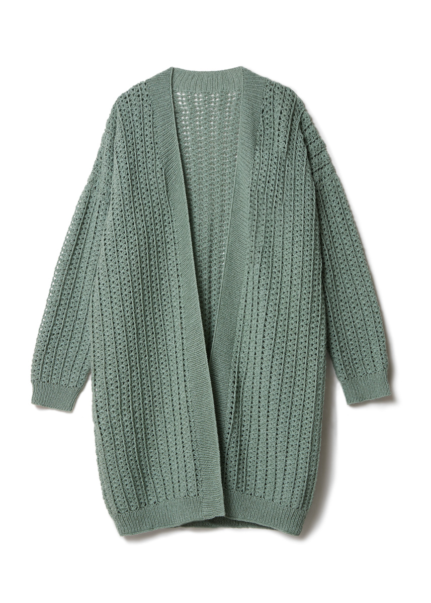 450 (500–550–600) г цвета зеле- ного шалфея (цв. 14) пряжи Sottile (85% хлопка, 15% шерсти мерино, 250 м/50 г) фирмы Lana Grossa; крючок № 4, круговые спицы № 3,5 длиной 120 см, чулочные спицы № 3,5.