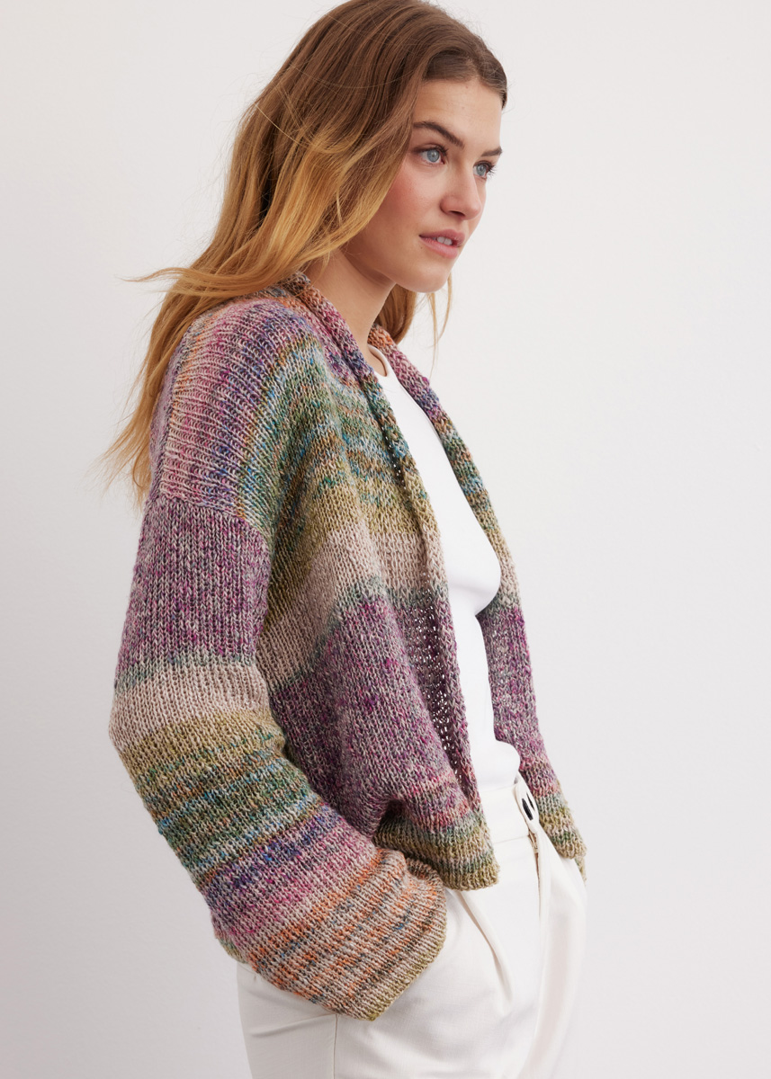 500 (600) г серо-бежевой/серой/цвета фуксии/ярко-розовой/ темно-оливковой/оранжевой (цв. 6) пря- жи Mosaico (54% хлопка, 23% льна, 23% вискозы, 270 м/100 г) фирмы Lana Grossa; прямые спицы № 3,5 и № 4