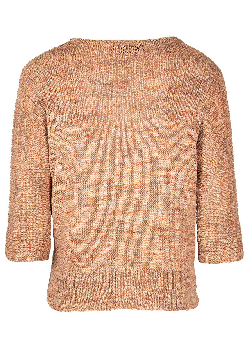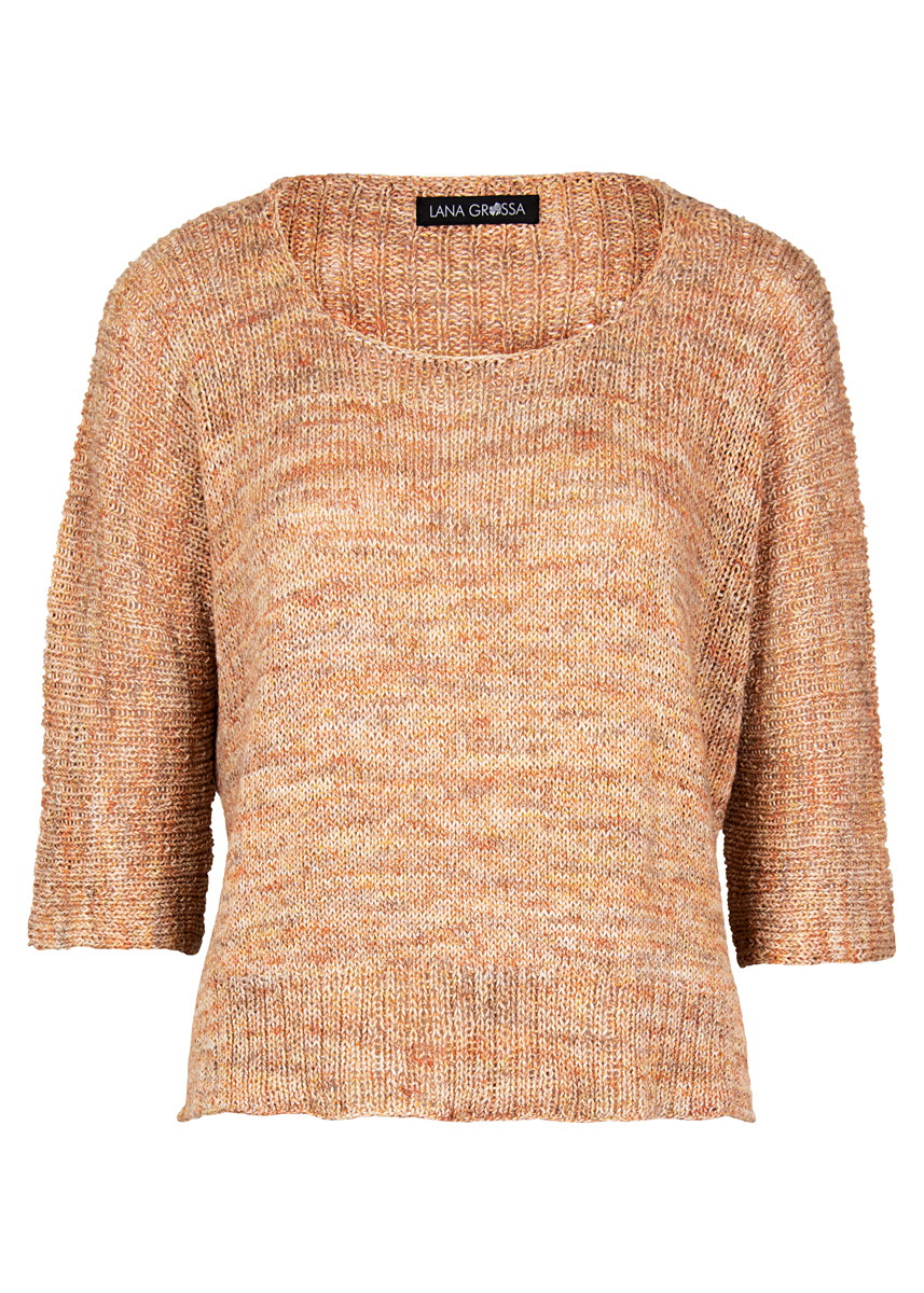 Lana Grossa-Qualität „Landlust Sommerseide Mélange” (50 % шёлк, 50 % хлопок, длина нити = ок. 170 m/50 g): ок. 300 (350 – 400) г бежевый/оранжевый/ коричневый t (цв. 101); сп. № 3,5, кр. сп. № 3,5, 60 и 100 см длиной