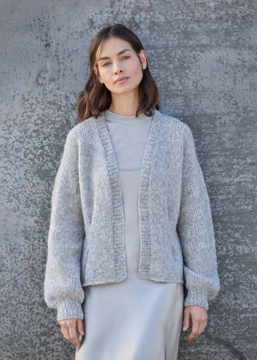 Lana Grossa-Qualität „Alpaca Air II“ (50 % альпака (файн), 27 % полиамид, 14 % хлопок, 9 % шерсть (меринос), длина нити = ок 140 m/50 g): 250 (300 - 300 - 350) г светло серый (цв 10); кр. сп. № 4,5 и 5; 1 крючок № 5; чул. сп. № 4,5; 1 игла.