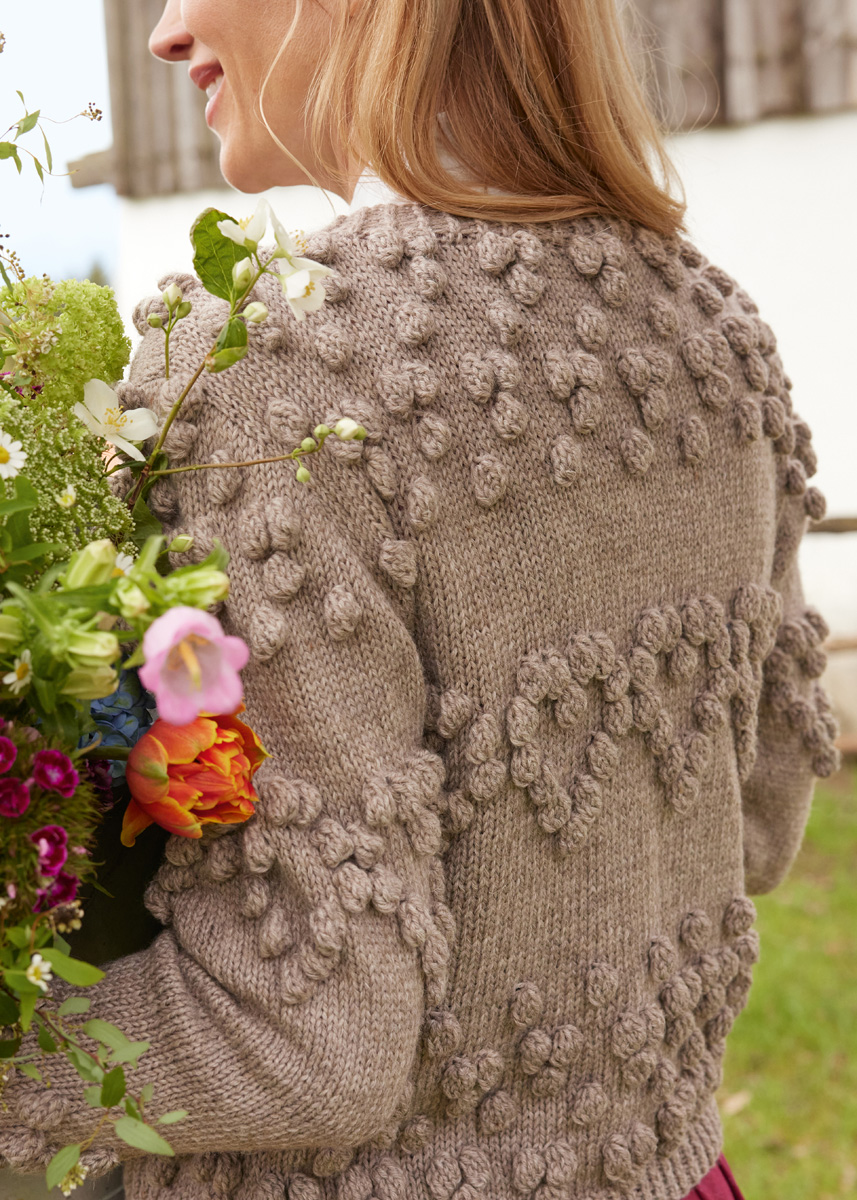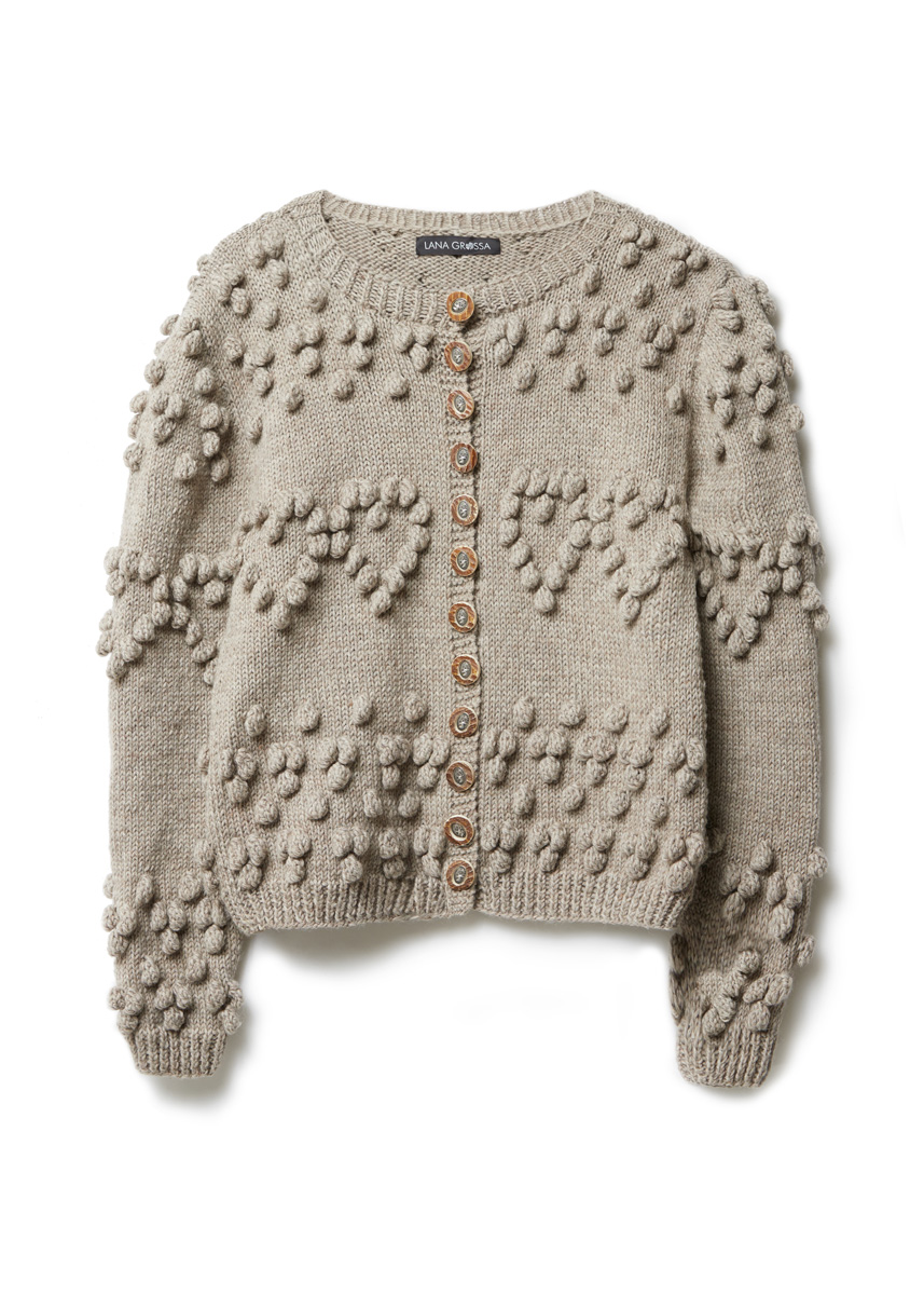 Lana Grossa Alpina (80% шерсть, 20% полиамид, длина нити 210 m/100 g) 700 (700–800) г светло коричневый (цв 1); сп. № 3,5 и 5, 1 кр. сп. № 3,5, 40 см, 12 пуговицы от UNION KNOPF, Ø 22 мм
