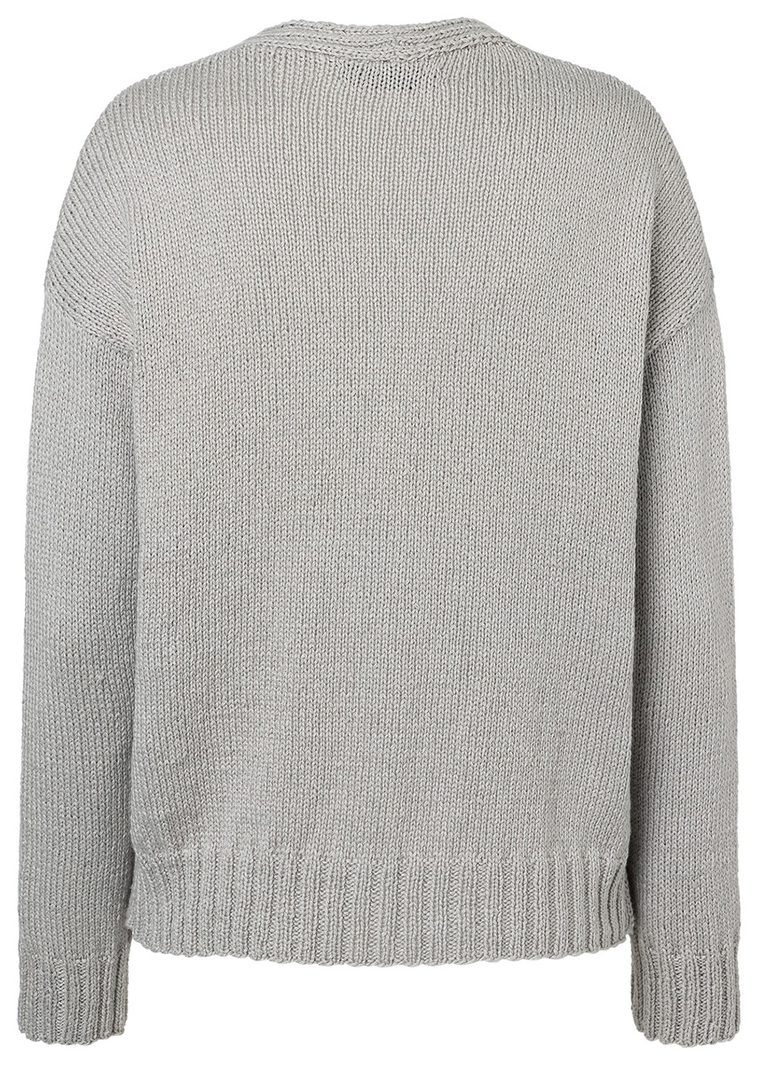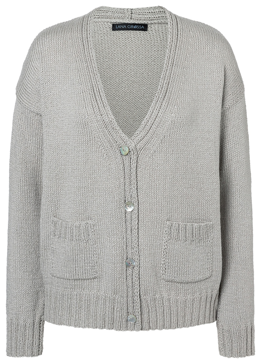 Lana Grossa Alta Moda Cotolana (45% шерсть (меринос), 45% пима хлопок, 10% полиамид, длина нити 150 m/50 g), 450 (500–550) г серо-бежевый (цв 8); сп. № 3,5 и 4, 4 пуговицы от UNION KNOPF, арт. 37604, цв. 12, размер 18 мм