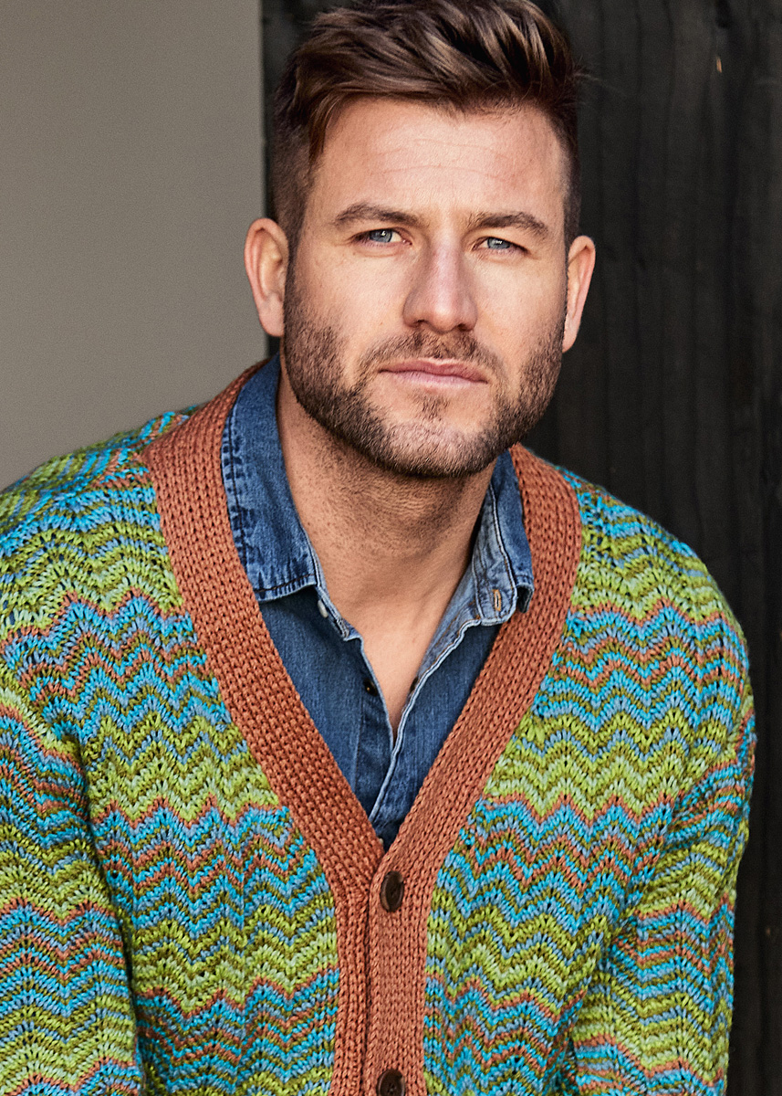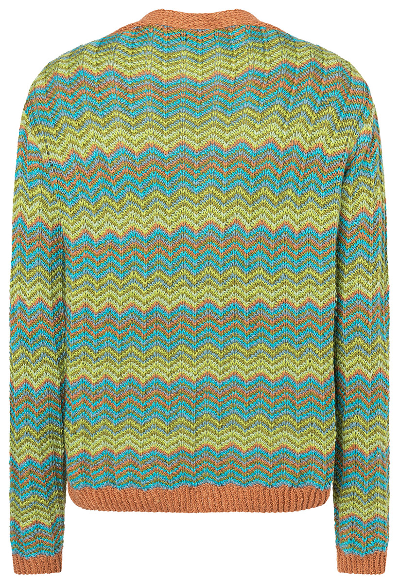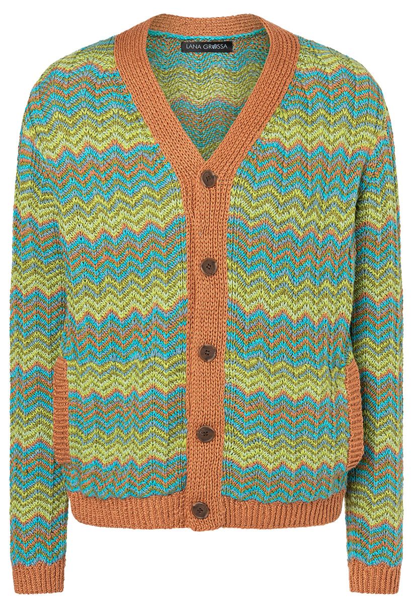 Lana Grossa Alta Moda Cotolana (45% шерсть (меринос), 45% пима хлопок, 10% полиамид, длина нити 150 m/50 g), 200 (250 – 250) г коричневый цвет корицы (цв 03), 150 (200 – 200) г оливковый (цв 26), 150 (200 – 200) г пастельный бирюзовый (цв 12), 100 (150 – 150) г бирюзовый (цв 28), 50 (100 – 100) г фисташковый (цв 27) и 50 (100 – 100) г зелёное яблоко (цв 10); сп. № 3,5, 4 и 5, 1 кр. сп. № 3,5, длиной 120 см, 2 вспом. сп. и 5 пуговицы от UNION KNOPF, арт. 39145, цв. коричневый, размер 23 мм