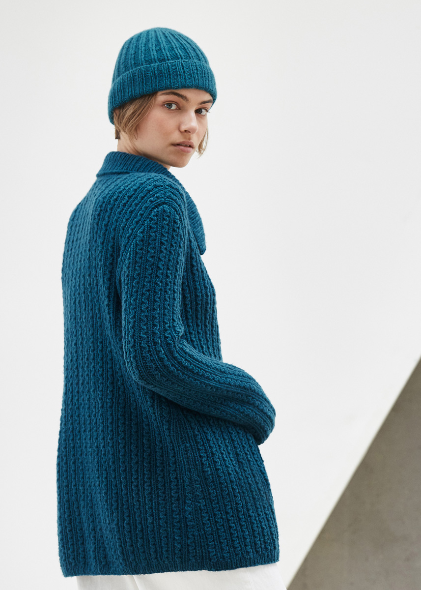 Lana Grossa Cashmere Moda (65% меринос, 25% кашемир, 10% полиэстер, длина нити 90 m/25 g), 500 (550 – 600) г темно сине-зеленый (цв 2); сп. № 6 и 1 кр. сп. № 6, длиной 40 см, 5 пуговицы от UNION KNOPF, арт. 37604, цв. 12, 18 мм