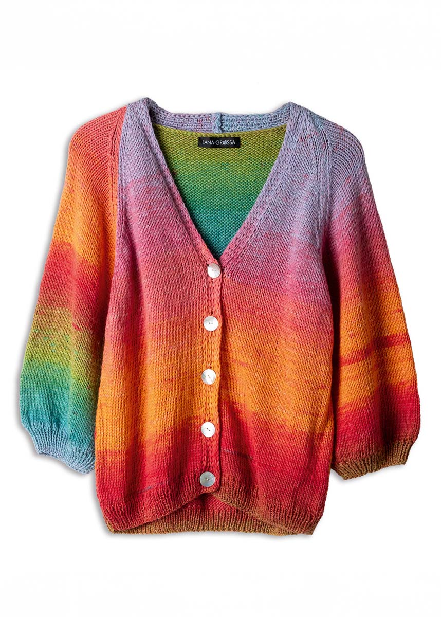 Lana Grossa-Qualität „Cotonella“ (100 % хлопок (пима), длина нити = ca 280 m/100 g): ок 400 (400–500–500) г сирень/светло-голубой/ зелено-бирюзовый/горчичный/ помидор/малиновый/оранжевый/лососевый (цв 11); сп. № 4 и 5; 5 пуговицы цв. 12, диам. ок 25 мм, № арт. 37604 от Union Knopf.