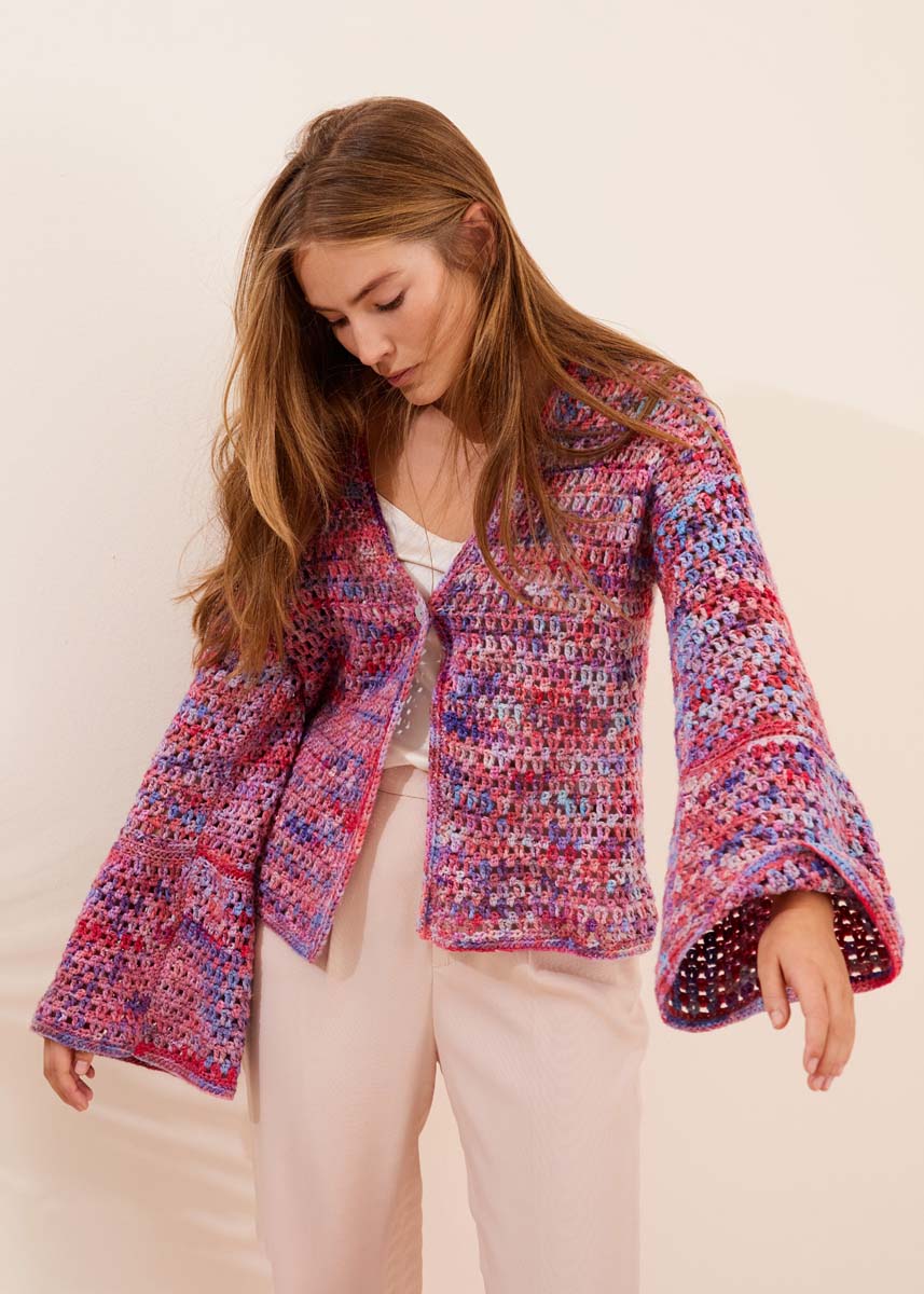 Lana Grossa-Qualität „Cotonella Multi“ (75 % хлопок, 25 % полиакрил, длина нити = ca 270 m/100 g): ок 500 (600–600–700) г EAN: 4033493378789 (цв 102); крючок № 5; пуговица подходящая по цв., диам. 20 мм.