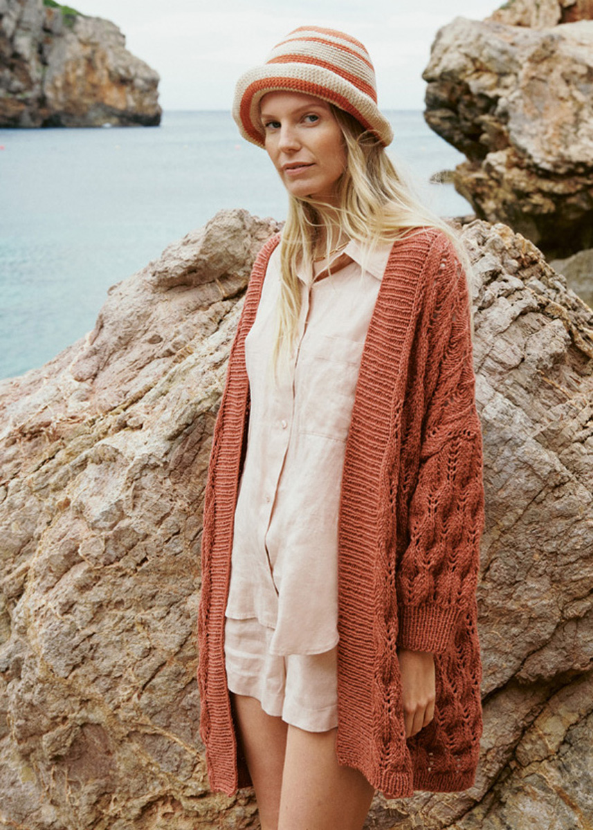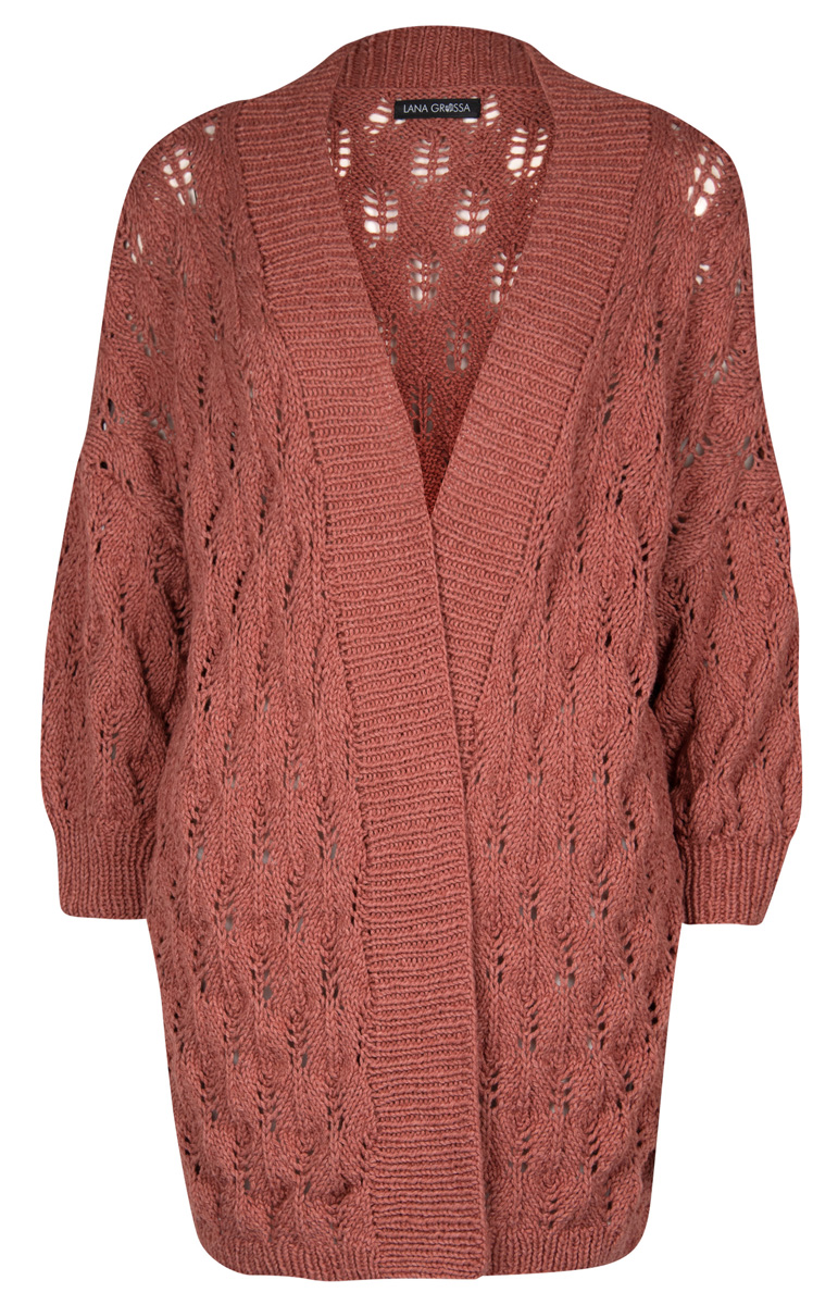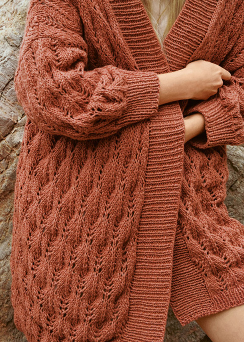 Lana Grossa-Qualität „Fourseason” (45 % (био) шерсть (меринос), 40 % (био) хлопок, 15 % перераб. кашемир, длина нити = ок. 105 m/50 g): ок. 550 г цвет ржавчины (цв. 38); сп. № 4 и 5, 1 кр. сп. № 4, длиной 120 см