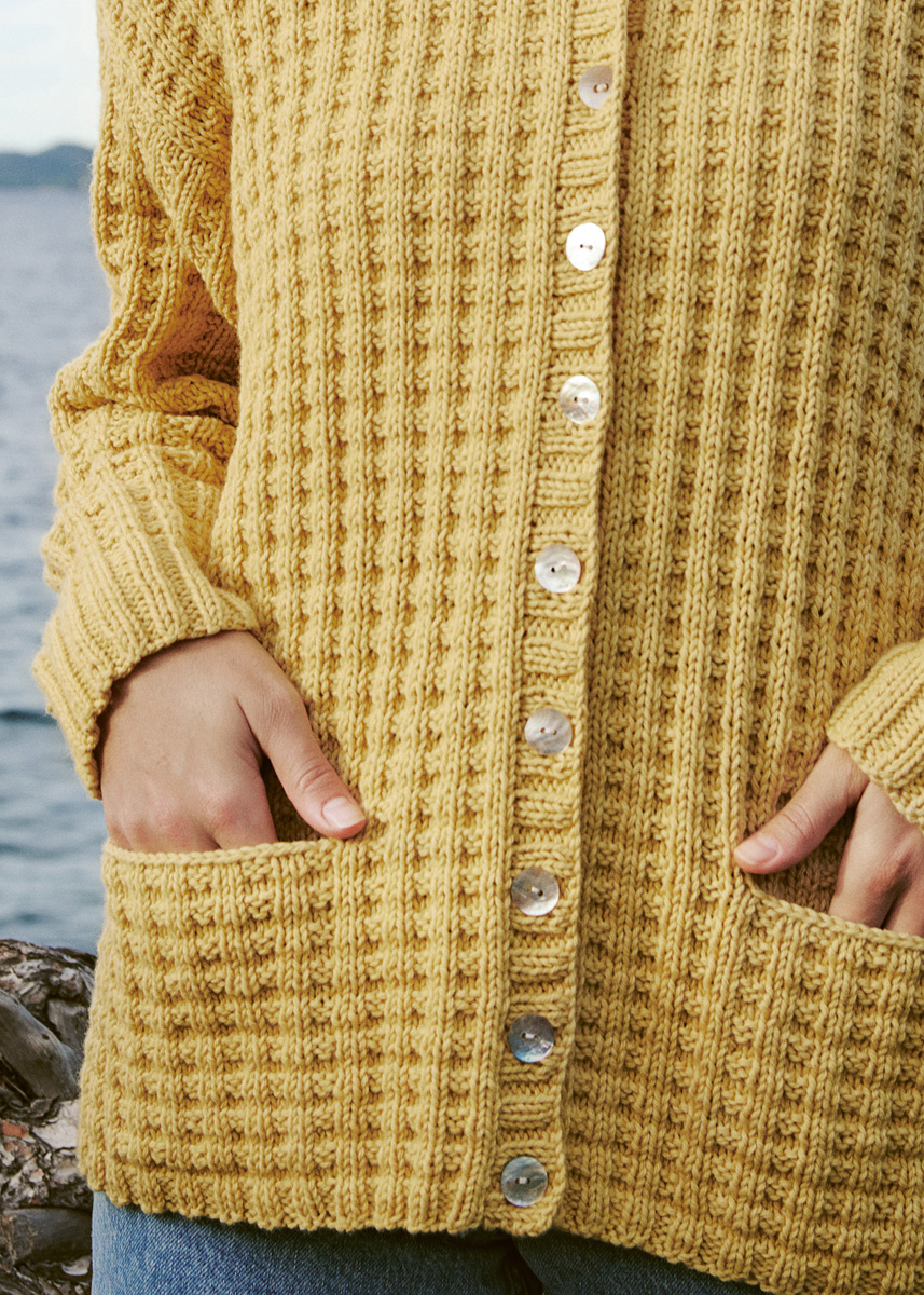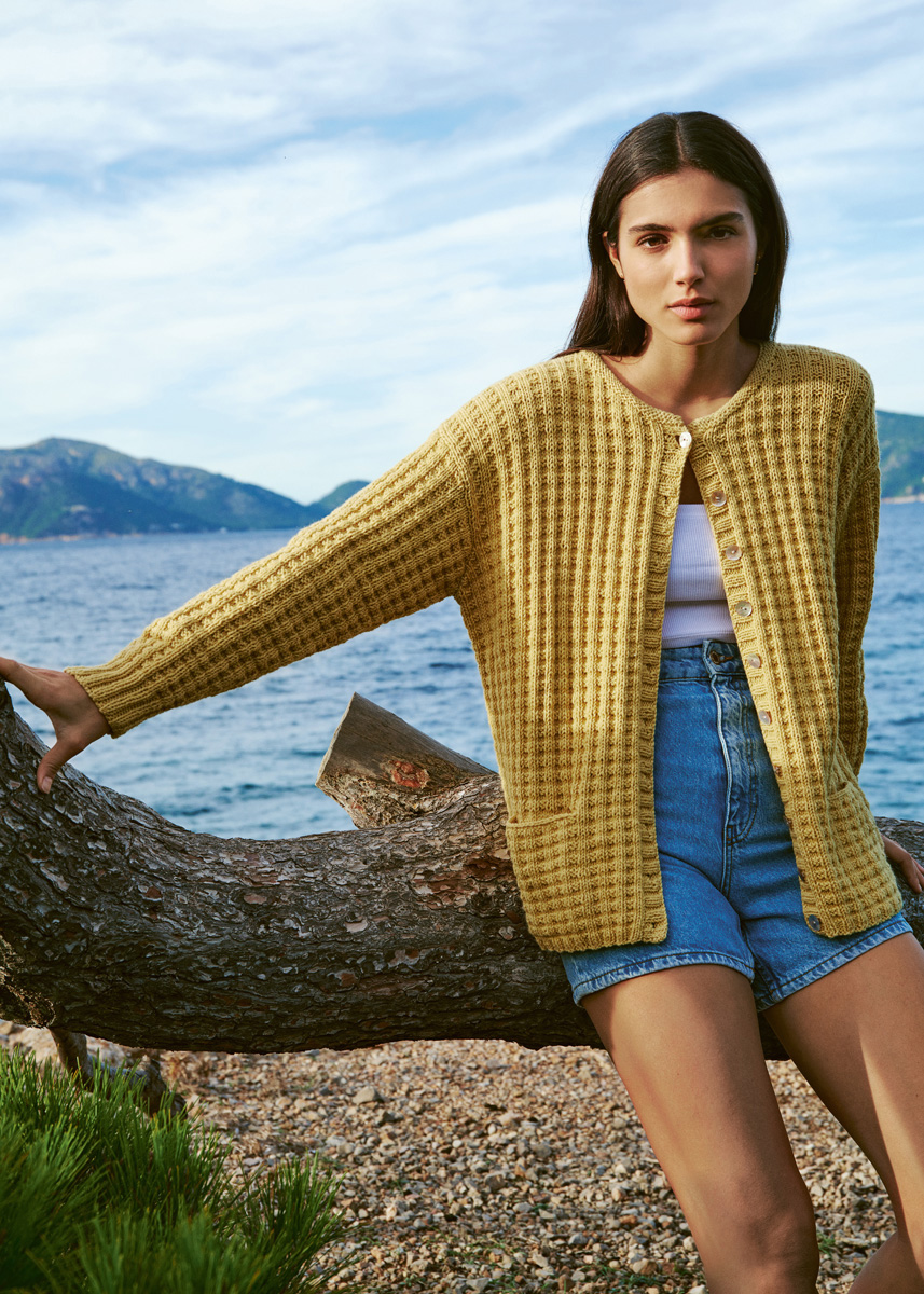 Lana Grossa-Qualität „Fourseason” (45 % (био) шерсть (меринос), 40 % (био) хлопок, 15 % перераб. кашемир, длина нити = ок. 105 m/50 g): ок. 600 (650–700) г жёлтый (цв. 8); сп. № 4 и 4,5, 1 кр. сп. № 4, длиной 80 см; 10 пуговицы, ø 18 мм