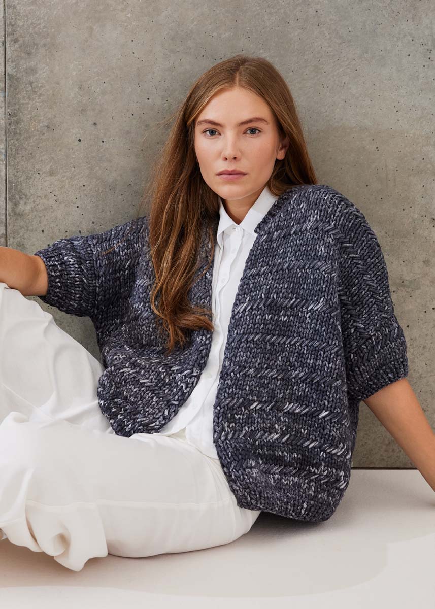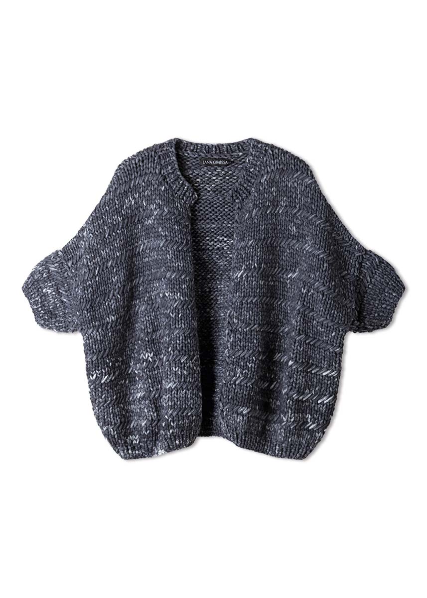 Lana Grossa-Qualität „Gelato Vintage“ (52 % хлопок, 48 % полиамид (перераб.), длина нити = ca 80 m/100 g): ок 700 (800–900–1000) г антрацитовый/белый (цв 110); сп. № 12 и 15, 1 кр. сп. № 12.
