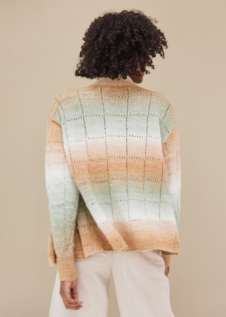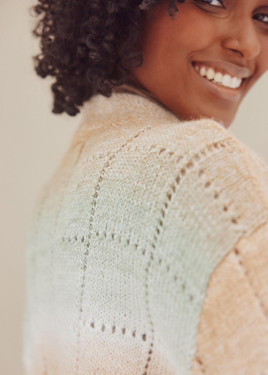 Lana Grossa-Qualität „Gomitolo Alpaca“ (42 % альпака (беби), 30 % полиакрил, 18 % полиамид, 10 % шерсть (меринос), длина нити = ок 350 m/100 g): 4 (4 - 4 - 5) мотка = ок 400 (400 - 400 - 500) г EAN: 4033493341851 (цв 371); сп. № 3 и 3,5; 5 кнопки, диам. 20 мм.