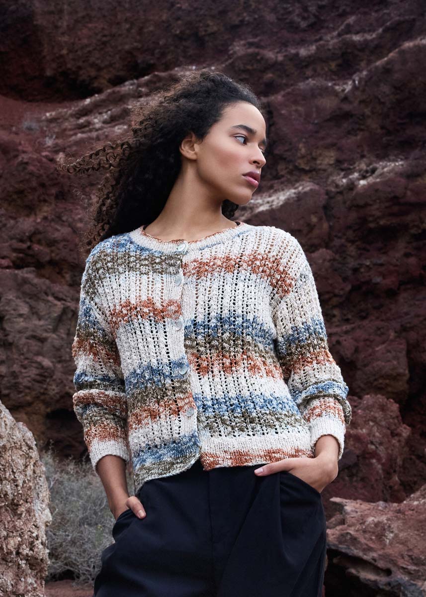 Lana Grossa-Qualität „Gomitolo Hippie“ (66 % хлопок, 30 % конопля, 4 % лён, длина нити = ca 300 m/100 g): 4 (4 - 5 - 5) мотки = ок 400 (400 - 500 - 500) г EAN: 4033493380584 (цв 3038); сп. № 2,5 и 3, 1 кр. сп. № 2,5; 6 пуговицы 18 мм