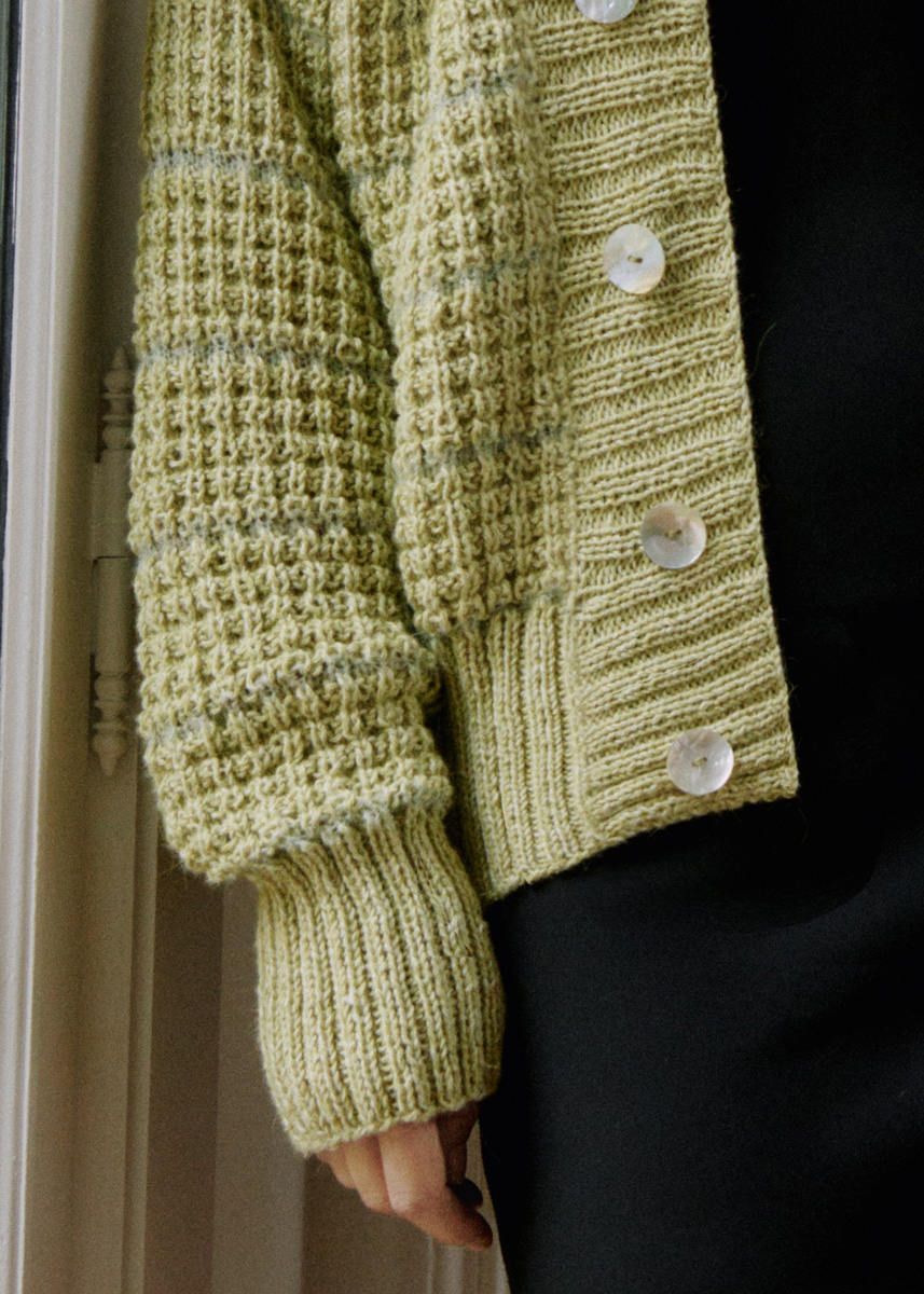 Lana Grossa-Qualität „Cara“ (57 % альпака (беби), 33 % хлопок, 10 % шерсть (меринос), длина нити = ок 120 m/50 g): ок 550 (550 - 600 - 650) г лайм (цв 13) и „Bella“ (35 % хлопок, 30 % нейлон, 25 % альпака (беби), 10 % шерсть (меринос), длина нити = ок 250 m/25 g): ок 25 (25 - 25 - 25) г шалфей (цв 9); сп. № 3 и 4; 5 пуговицы в чисто белом, 25 мм.