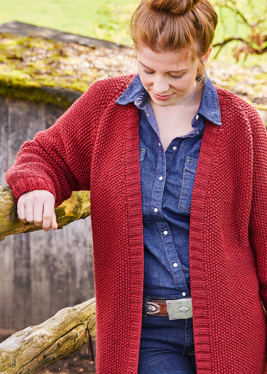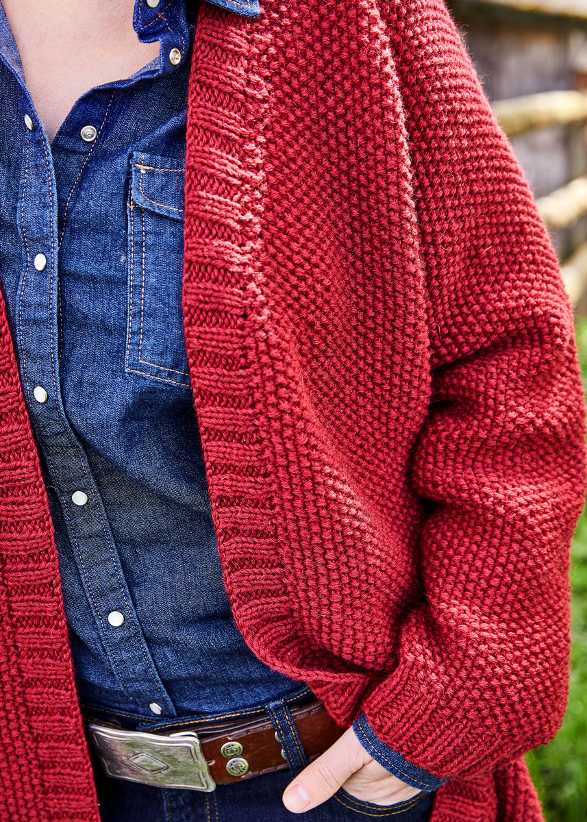 Lana Grossa-Qualität „Landlust Alpaka Merino 160“ (50% беби альпака, 50% шерсть меринос, длина нити 160 m/50 g), 1000 (1100–1200–1300) г бордо (цв 420); сп. № 4,5 и 5, 1 кр. сп. № 4,5, длиной120 см.