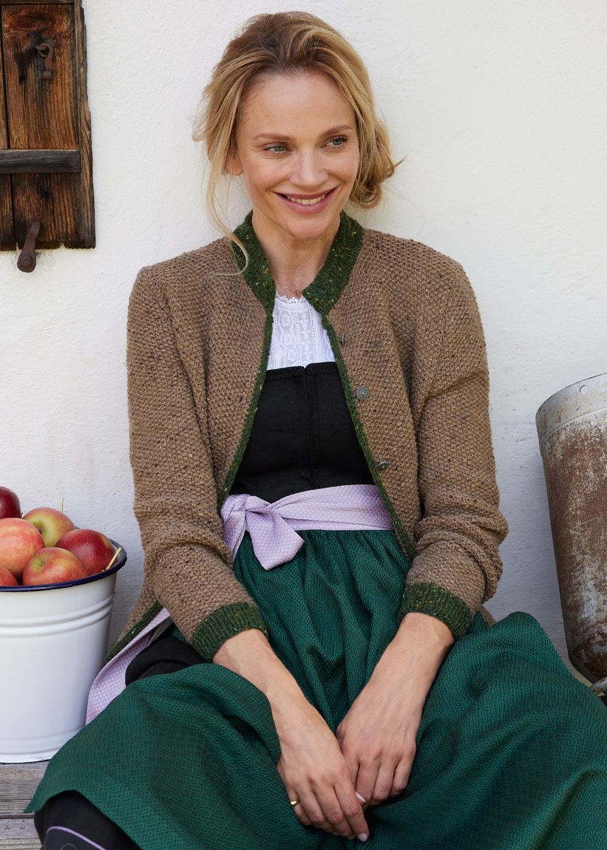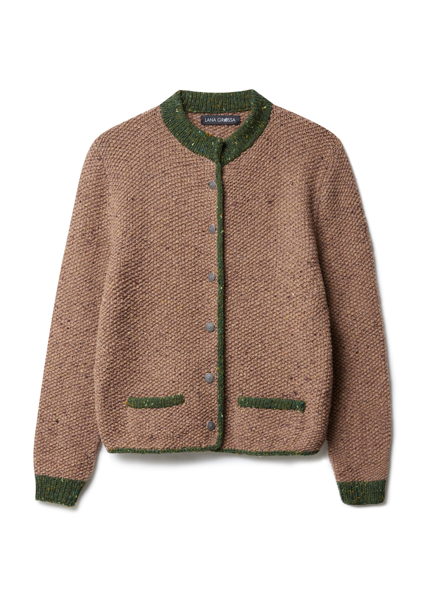 Lana Grossa Landlust Soft Tweed 180 (100% шерсть, длина нити 180 m/50 g), 300 (350–400 – 450) г нуга меланжевый (цв 109) и 50 г тёмно- зелёный меланжевый (цв 107); сп. № 5 и по 1 кр. сп. № 4,5, 40 и 100 см, 6 пуговицы от UNION KNOPF, серебренные, Ø 15 мм.