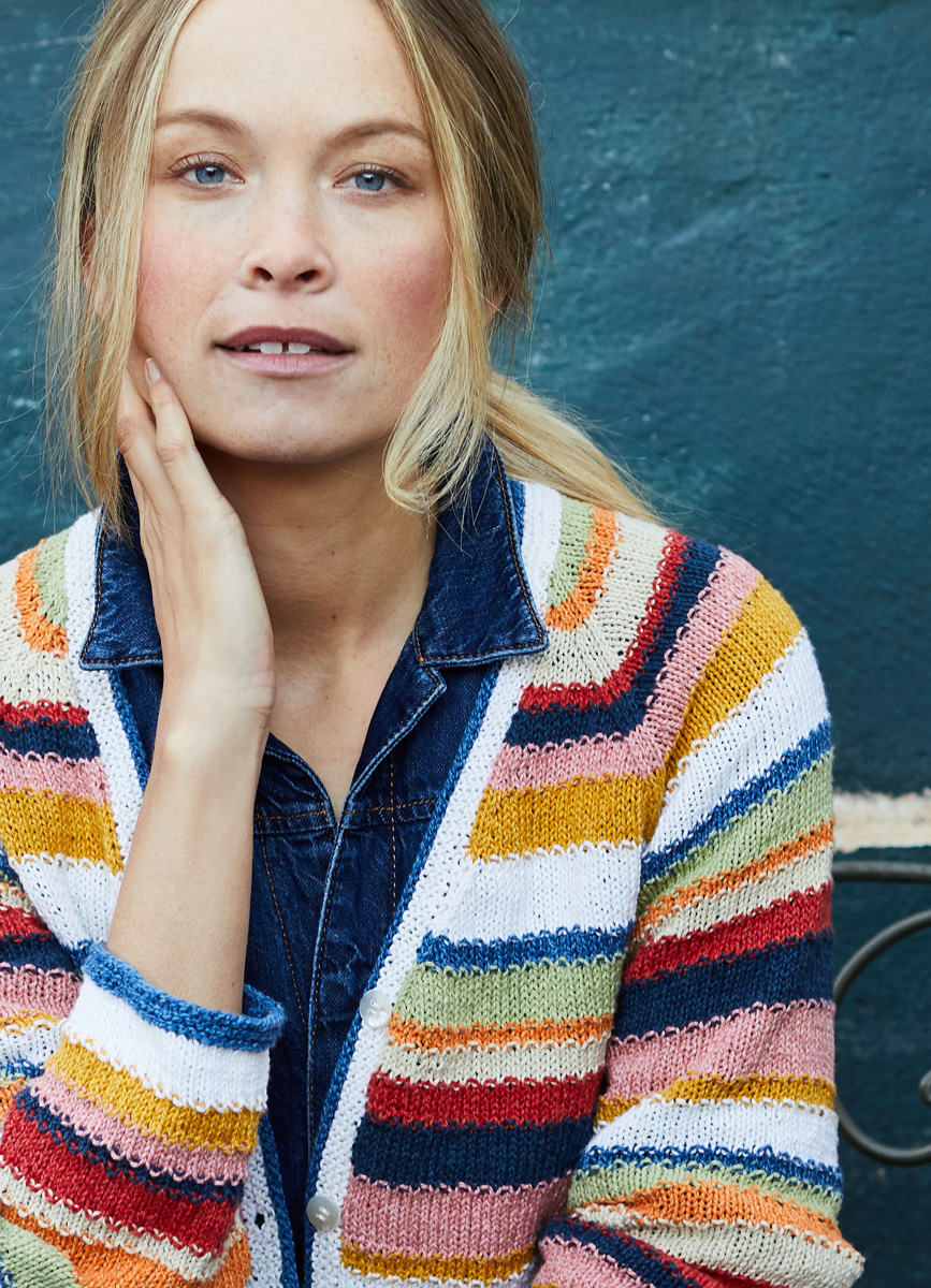 Lana Grossa-Qualität „Landlust Sommerseide“ (50% шёлк, 50% хлопок, длина нитки 170 m/50 g), 150 (150 - 200 - 200) г белый (цв 1), 50 (100 - 100 - 100) г натуральный (цв 2), 50 (50 - 50 - 100) г мягко-зеленый (цв 3), 50 (50 - 50 - 100) г синий (цв 7), 50 (50 - 50 - 100) г чёрно-синий (цв 9), 100 (100 - 100 - 100) г оранжевый (цв 10), 100 (100 - 100 - 100) г красный (цв 11), 100 (100 - 100 - 100) г лосось розовый (цв 13), 50 (50 - 50 - 50) г золотисто-жёлтый (цв 18), кр. сп. № 3 и 3,5; 6 кнопки ок. 15 мм