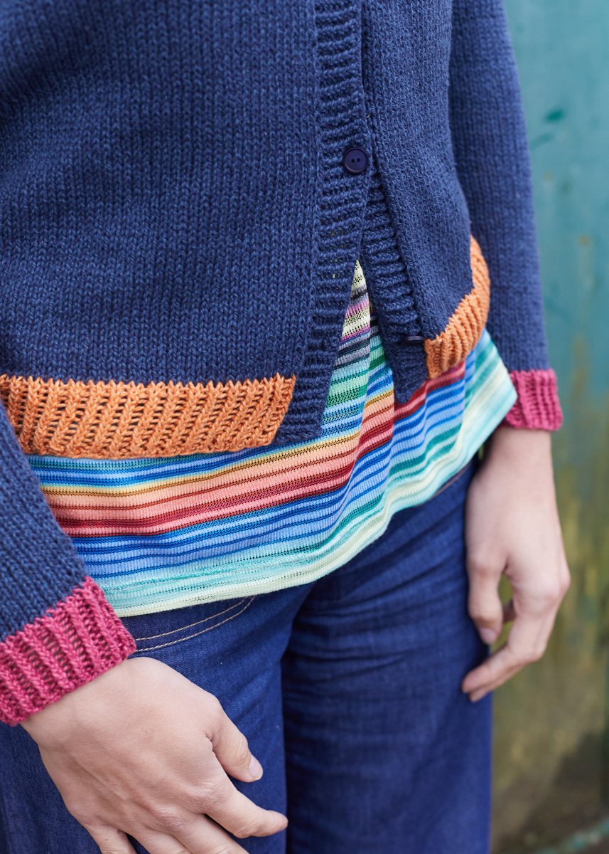 Lana Grossa-Qualität „Landlust Sommerseide“ (50% шёлк, 50% хлопок, длина нити 170 m/50 g), 250 (300 - 350 - 400) г черно - синий (цв 9) и по 50 г оранжевый (цв 10), красно розовый (цв 20) и цикламеновый (цв 12); сп. № 3,5 и 4, 1 кр. сп. № 4, 50 см длиной; 6 синие пуговицы, 12 мм
