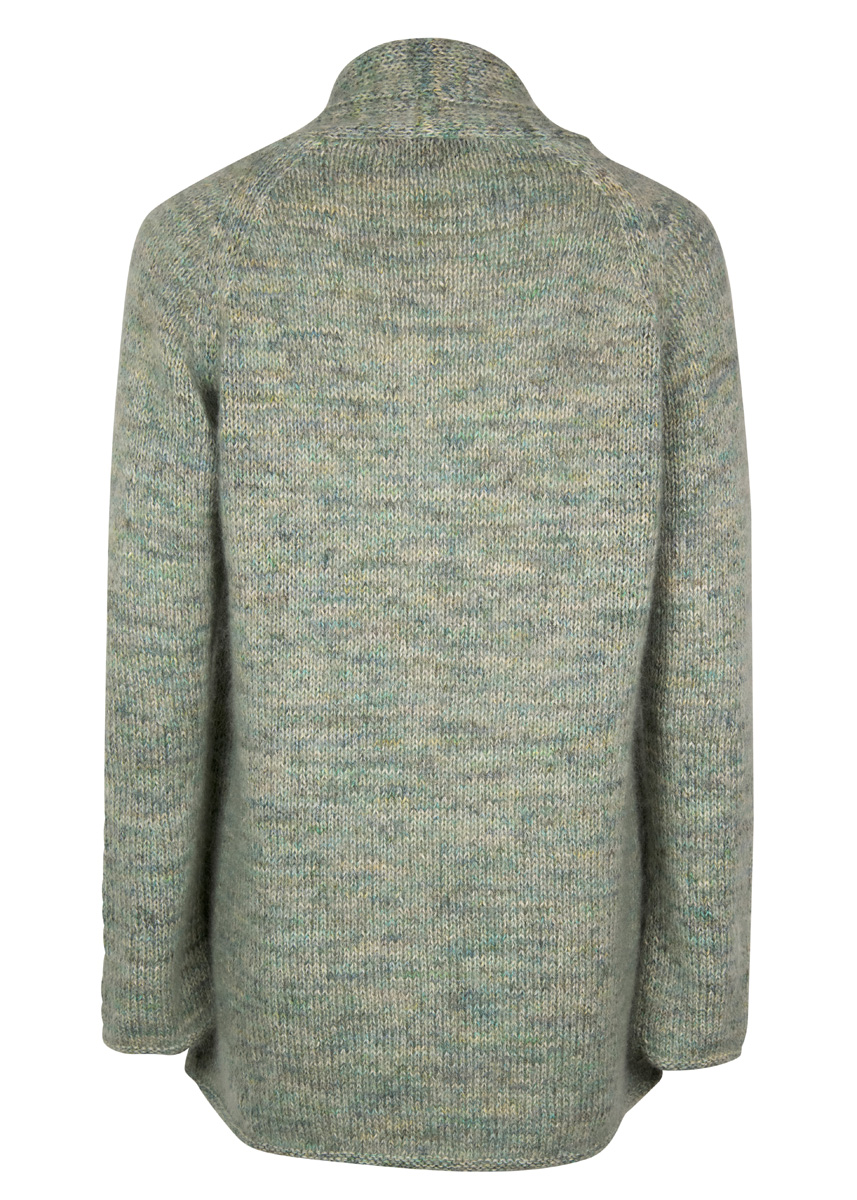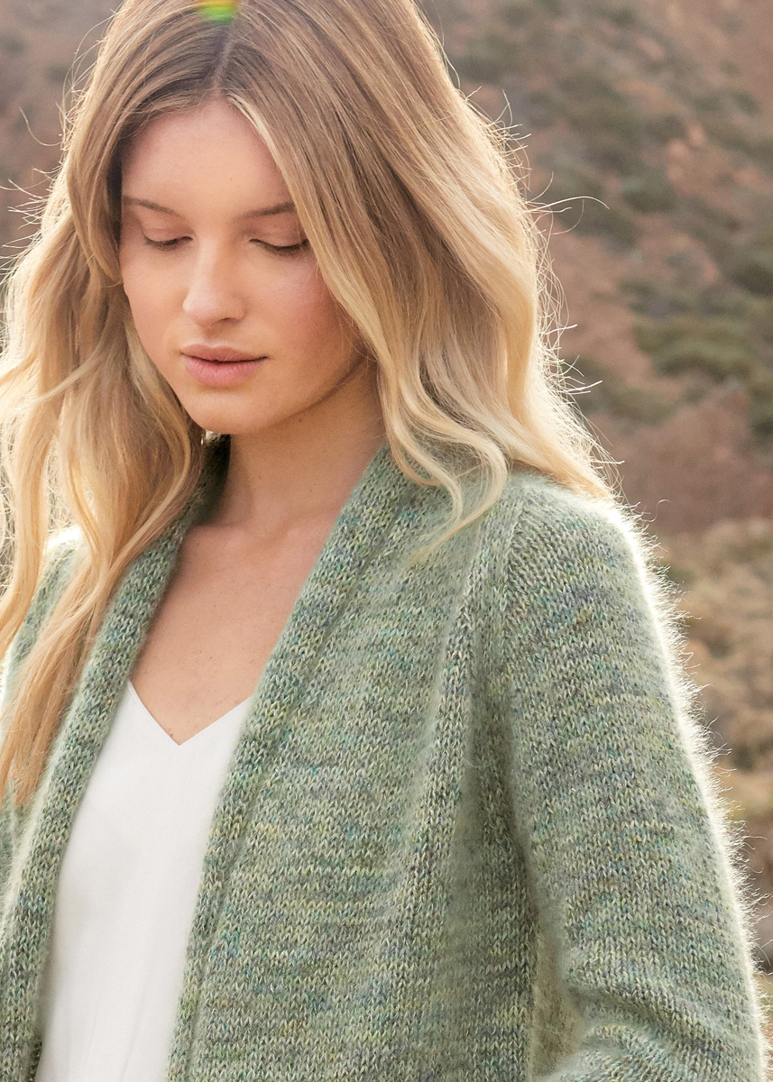 Lana Grossa-Qualität „Landlust Sommerseide Mélange” (50 % шёлк, 50 % хлопок, длина нитки = 170 m/50 g): 350 (400) г бирюзовый/ жёлтый/ зелёный (цв. 105) и Lana Grossa-Qualität „Silkhair” (70 % мохер), 30 % шёлк, длина нити = ок. 210 m/25 g): ок. 150 (175) г бело-зеленый (цв. 140); сп. № 4,5 и 5, 1 кр. сп. № 4,5, 60 см длиной