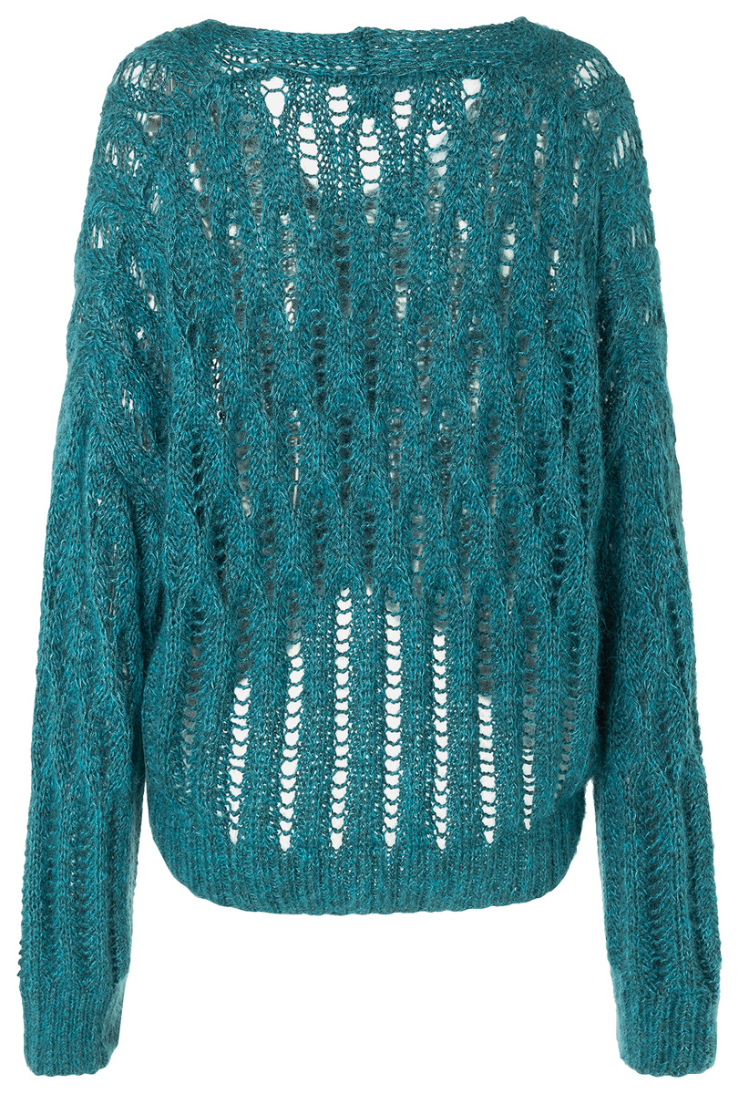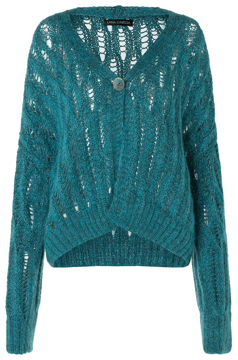Lana Grossa-Qualität „Linarte” (40 % вискоза, 30 % хлопок, 20 % лён, 10 % полиамид, длина нитки = ca. 125 m/50 g): ок. 550 г темно сине-зелёный (цв. 73) и Lana Grossa- Qualität „Silkhair” (70 % мохер (суперкид), 30 % шёлк, длина нити = ca. 210 m/25 g): ок. 150 г синяя лагуна (цв. 151); сп. № 4 и 5; 1 пуговица, ø 30 мм