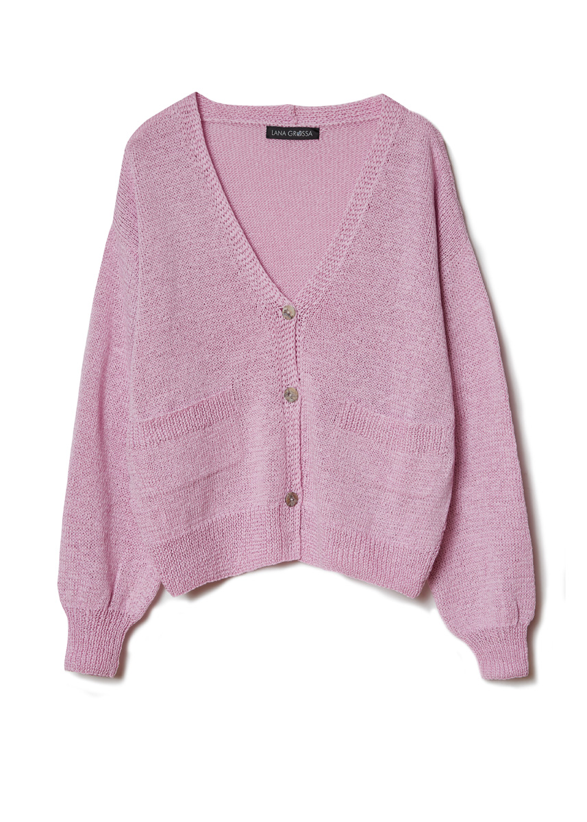 Lana Grossa-Qualität „Nastrino” (100 % хлопок, длина нити = ок. 190 m/50 g): ок. 350 (400) г розовый (цв. 6); сп. № 3 и 4; 3 пуговицы, ø 18 мм