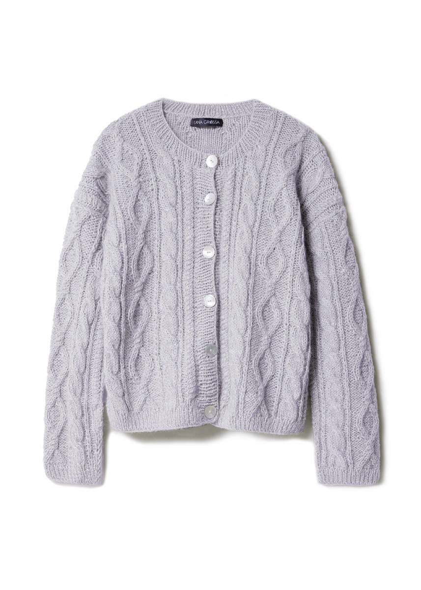 Lana Grossa Natural Alpaca Classico (85% альпака (беби), 15% шерсть (меринос), длина нити 125 m/50 g), 450 (500 – 550) г светло серый (цв 102) и Lana Grossa Setasuri (69% альпака (Suri), 31% шёлк, длина нити 212 m/25 g), 150 (150 – 175) г светло серый (цв 19); сп. № 4,5 и 5,5, 1 кр. сп. № 4,5, 40 см, 1 вспом. сп., 6 пуговиц от UNION KNOPF, Ø 22 мм.